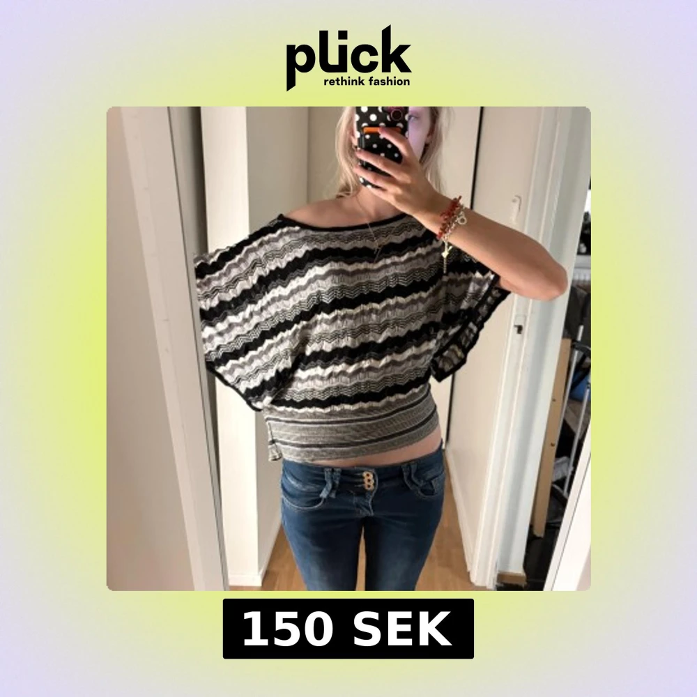 Säljer en luftig och cool blus med offshoulder och bred midjeresår. Toppen har vågiga ränder i svart, grått och vitt, och är tillverkad i ett lätt stickat material. Perfekt för dig som gillar avslappnad stil med lite edge. storlek 36/38