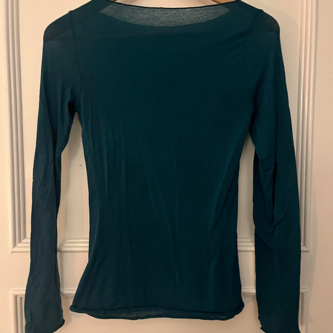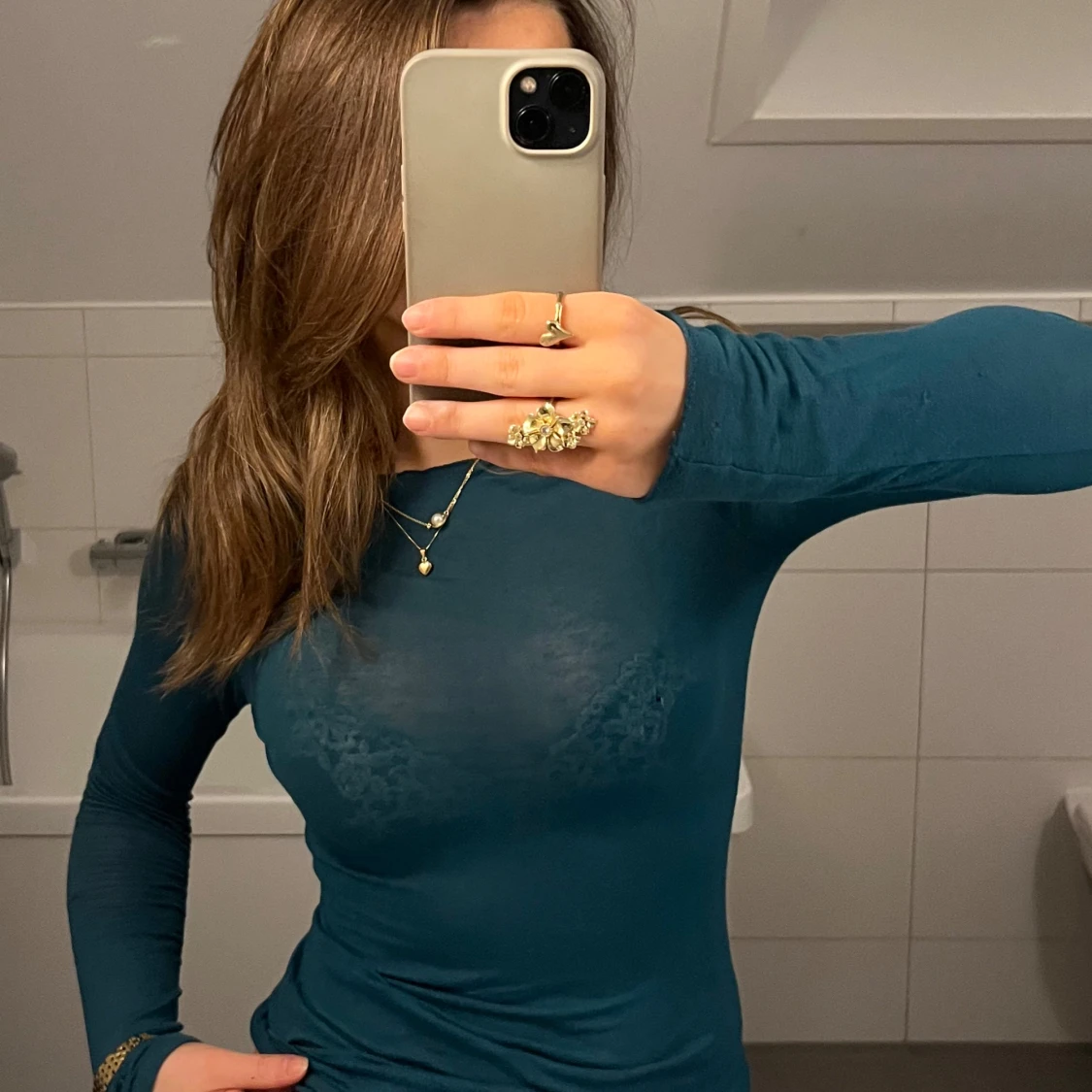 Säljer en stilren petrolblå långärmad topp med en tight passform. Perfekt för en elegant och enkel look. Toppen är i tunt material och har därför litet hål vid armen💗skriv gärna för fler bilder eller funderingar💞