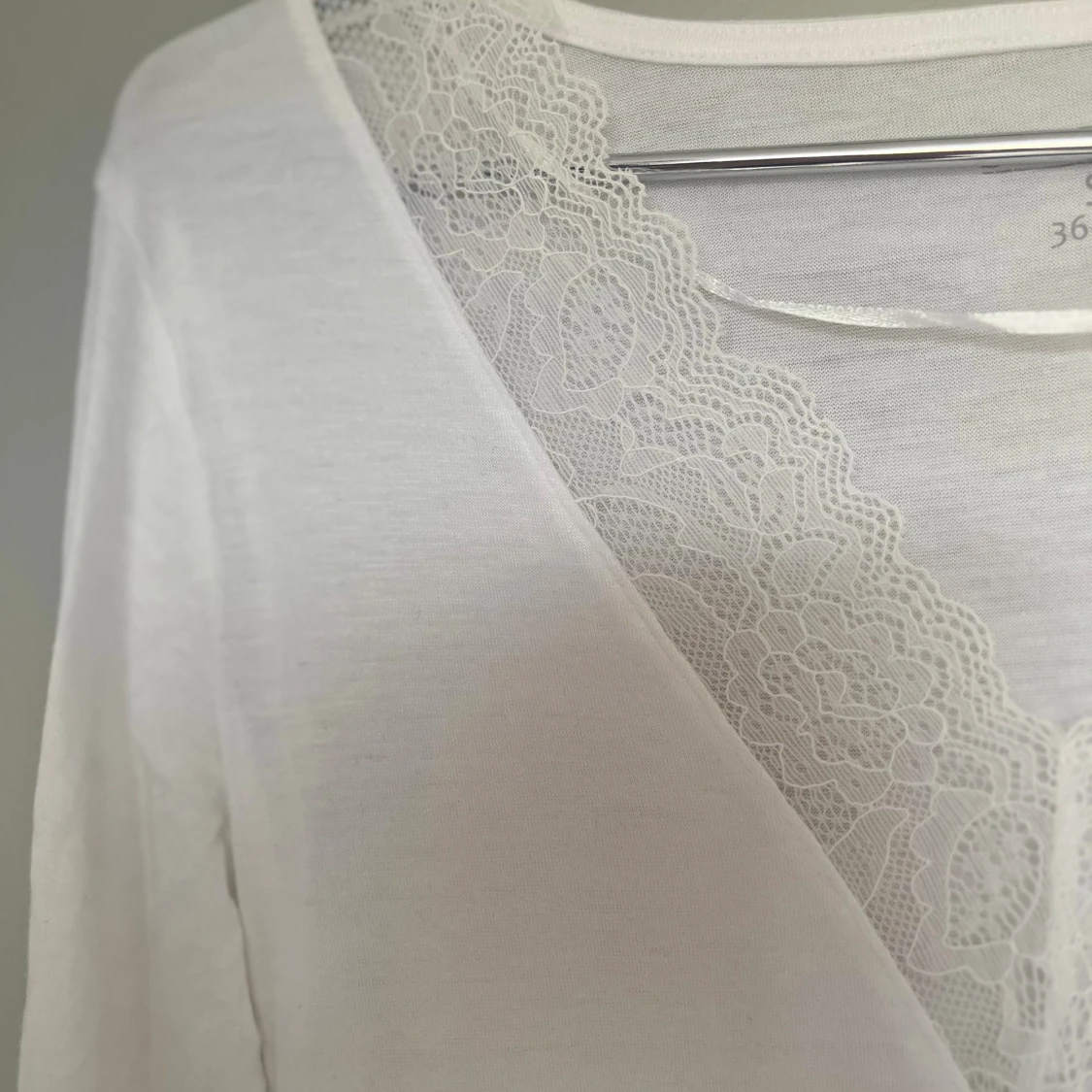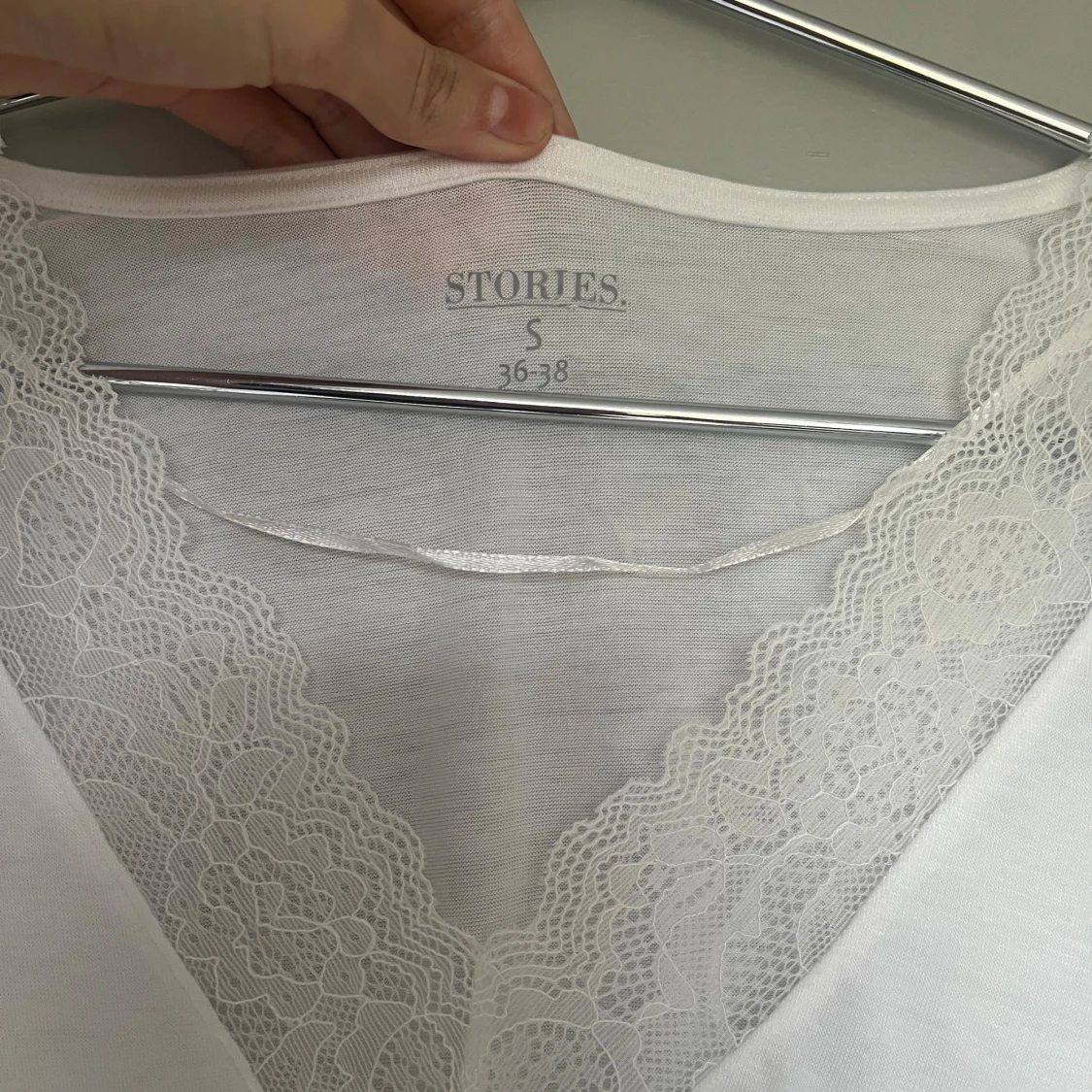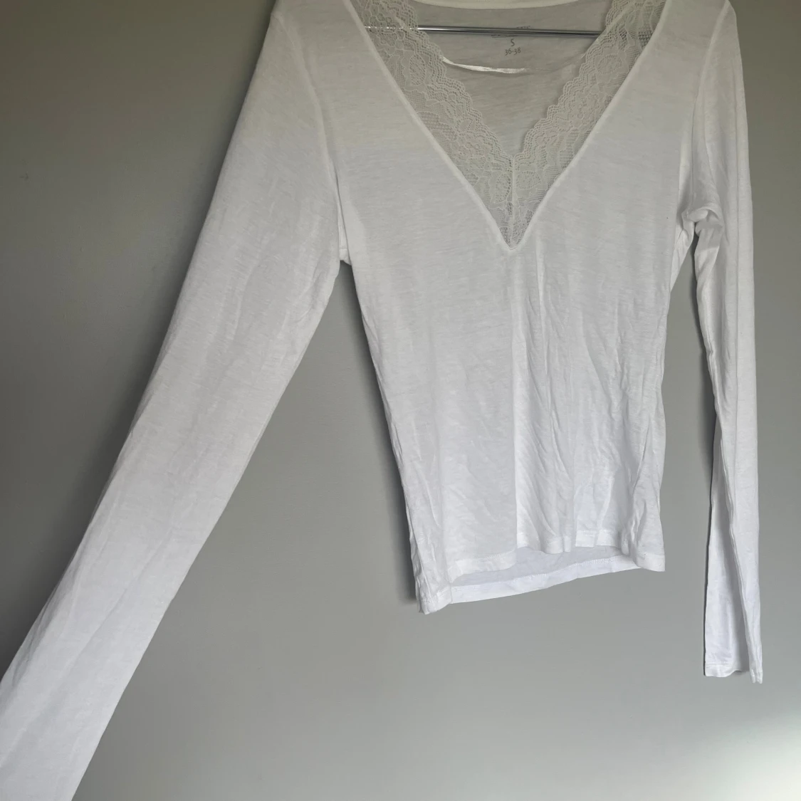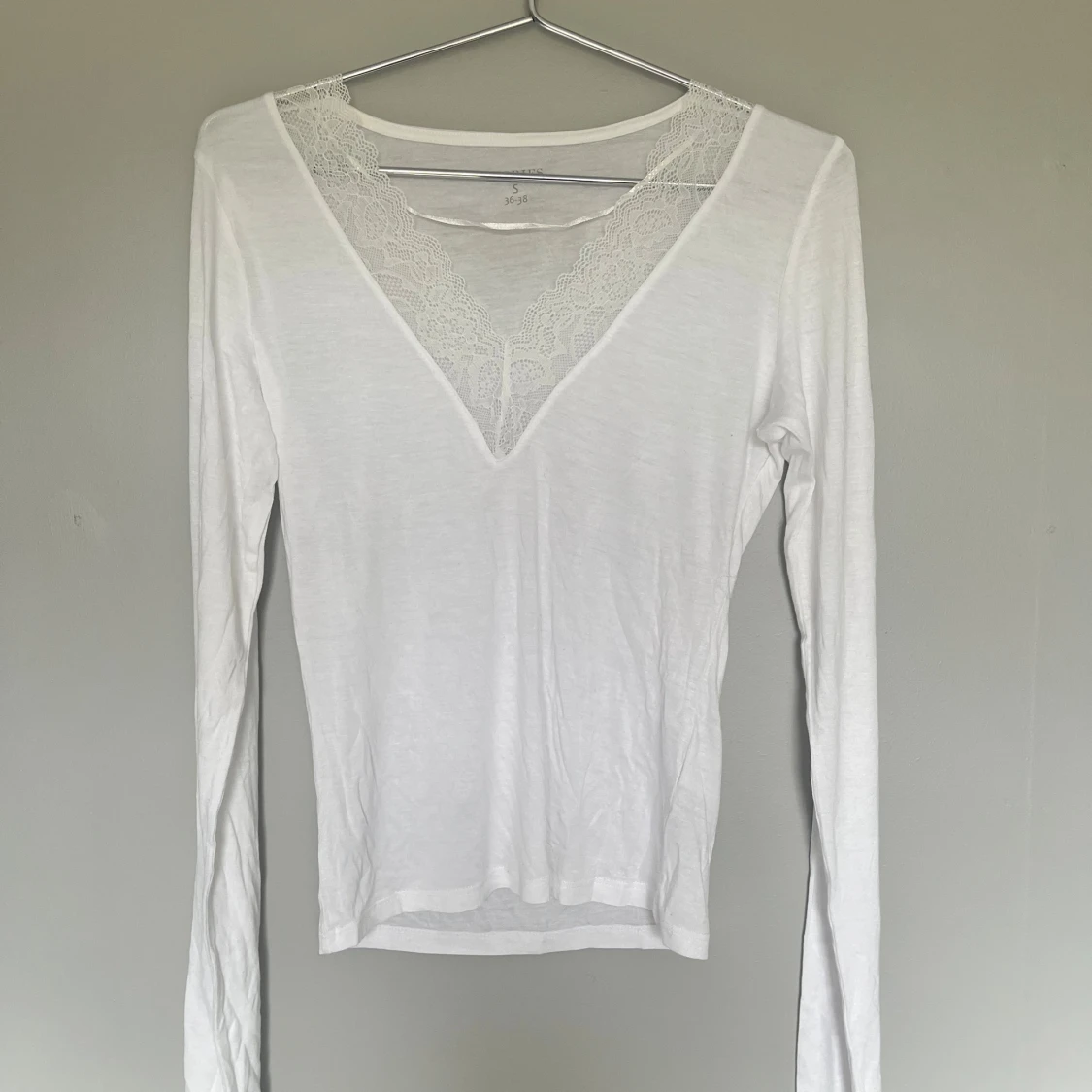Vit v-ringad tröja med spets, aldrig använd så den är helt ny och inga skavanker förekommer! Hör av dig vid eventuella frågor!🤍