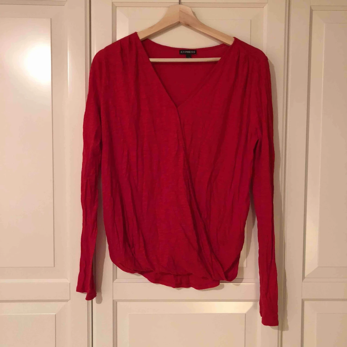 Röd omlottblus från Express i USA i storlek XS/34. Behövs strykas Hund finns i hemmet