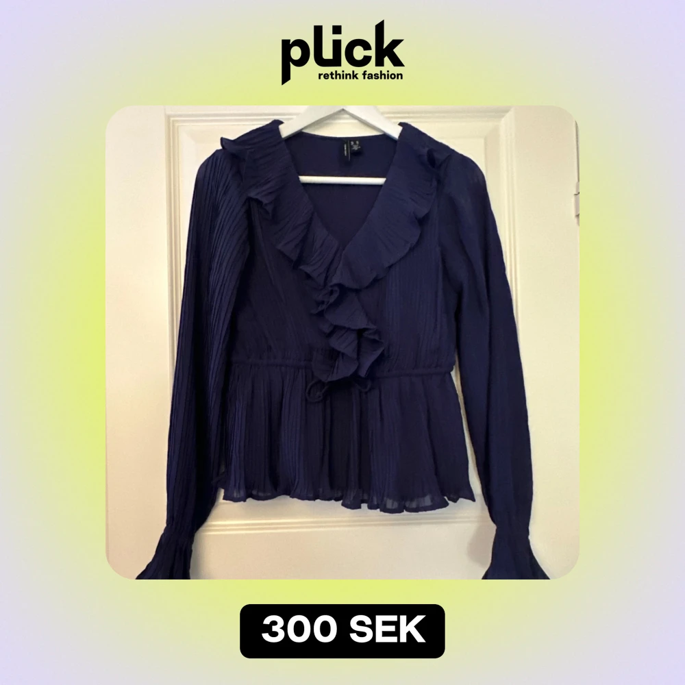 Jättefin mörkblå blus från Vero Moda. Blusen är i nyskick då den endast är andvänd 2 gånger. Det finns en knytning i midjan där man kan välja själv hur tight blusen ska sitta.