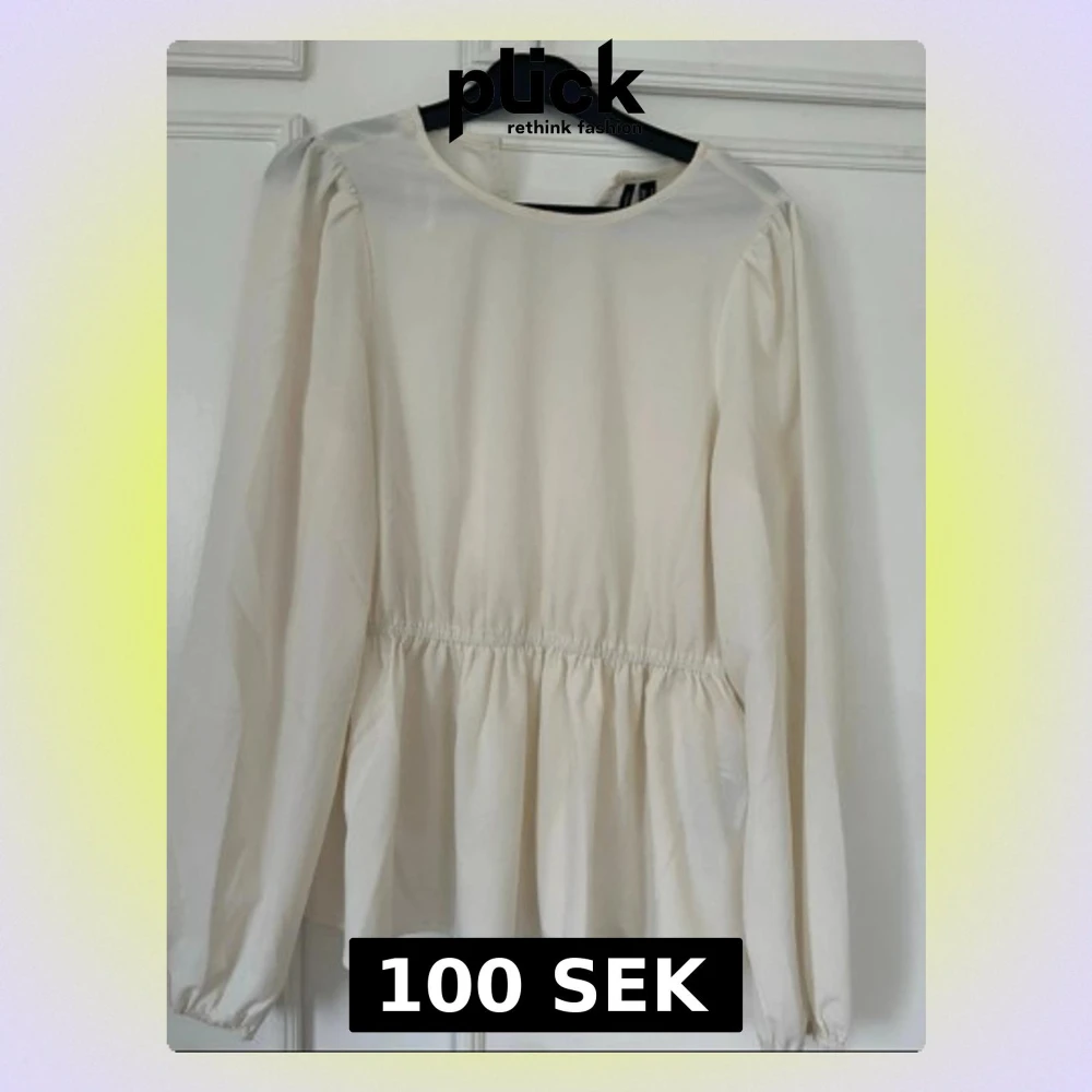 Snygg krämvit blus fmed rund halsringning och volang nedtill. Blusen har långa ärmar med lätt puff och resår i midjan för en feminin siluett. Perfekt att styla med jeans eller kjol för en trendig look.