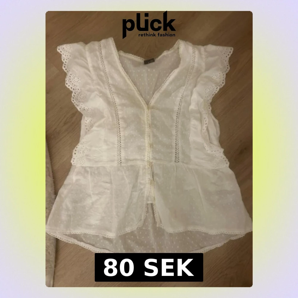 En vit blus med volanger. Den är i storlek L vilket för mig känns lite konstigt då den sitter perfekt på mig som vanligtvis har S. Skriv om ni vill ha bild hur den sitter på så fixar jag. Den är använd nån enstaka gång men ser helt ny ut.