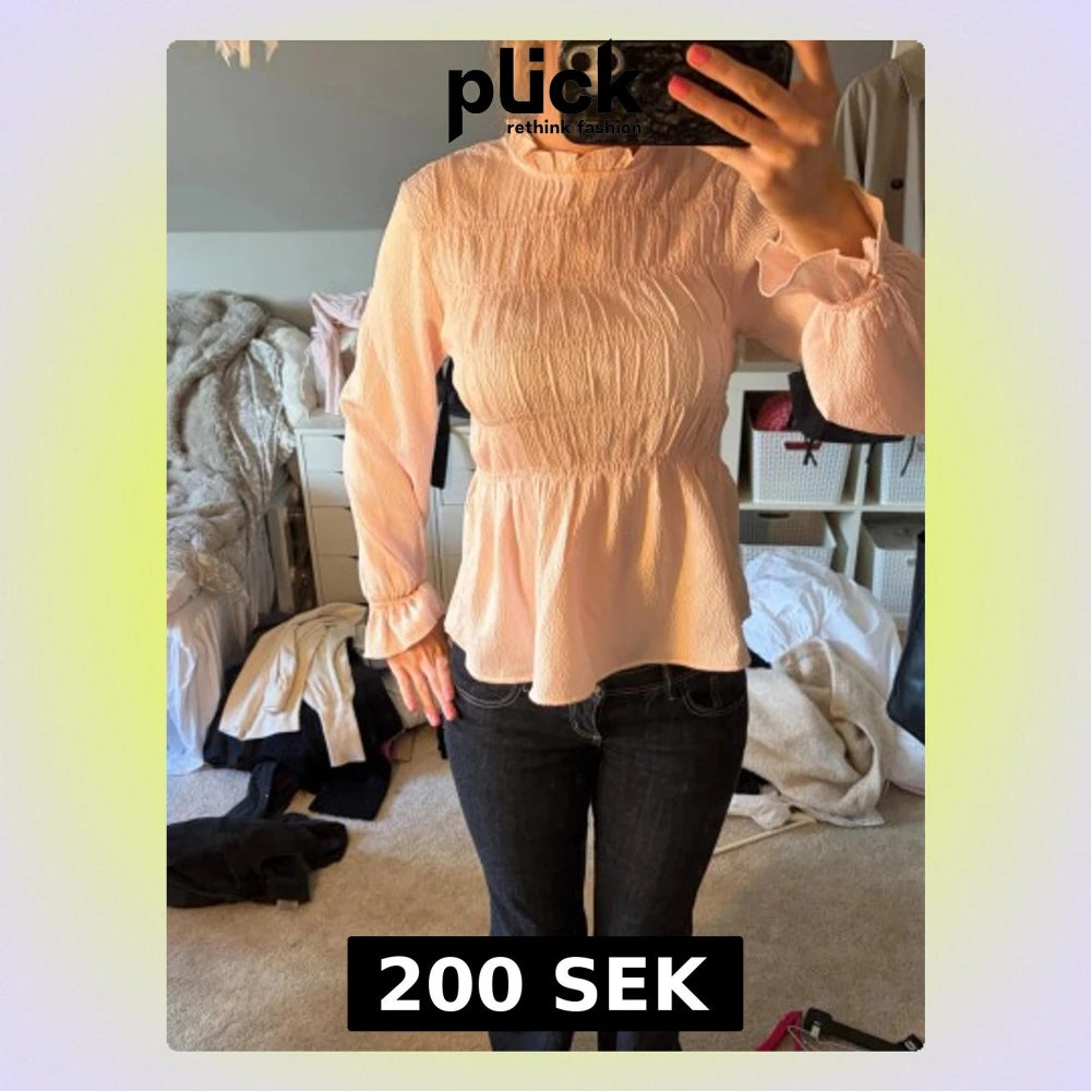 Supersöt ljusrosa blus från Vero Moda med hög krage och volangdetaljer. Blusen har långärmad design, smockad struktur och lätt utsvängd midja som ger en feminin siluett. Tillverkad i ett tunt, strukturerat tyg som känns luftigt och bekvämt.