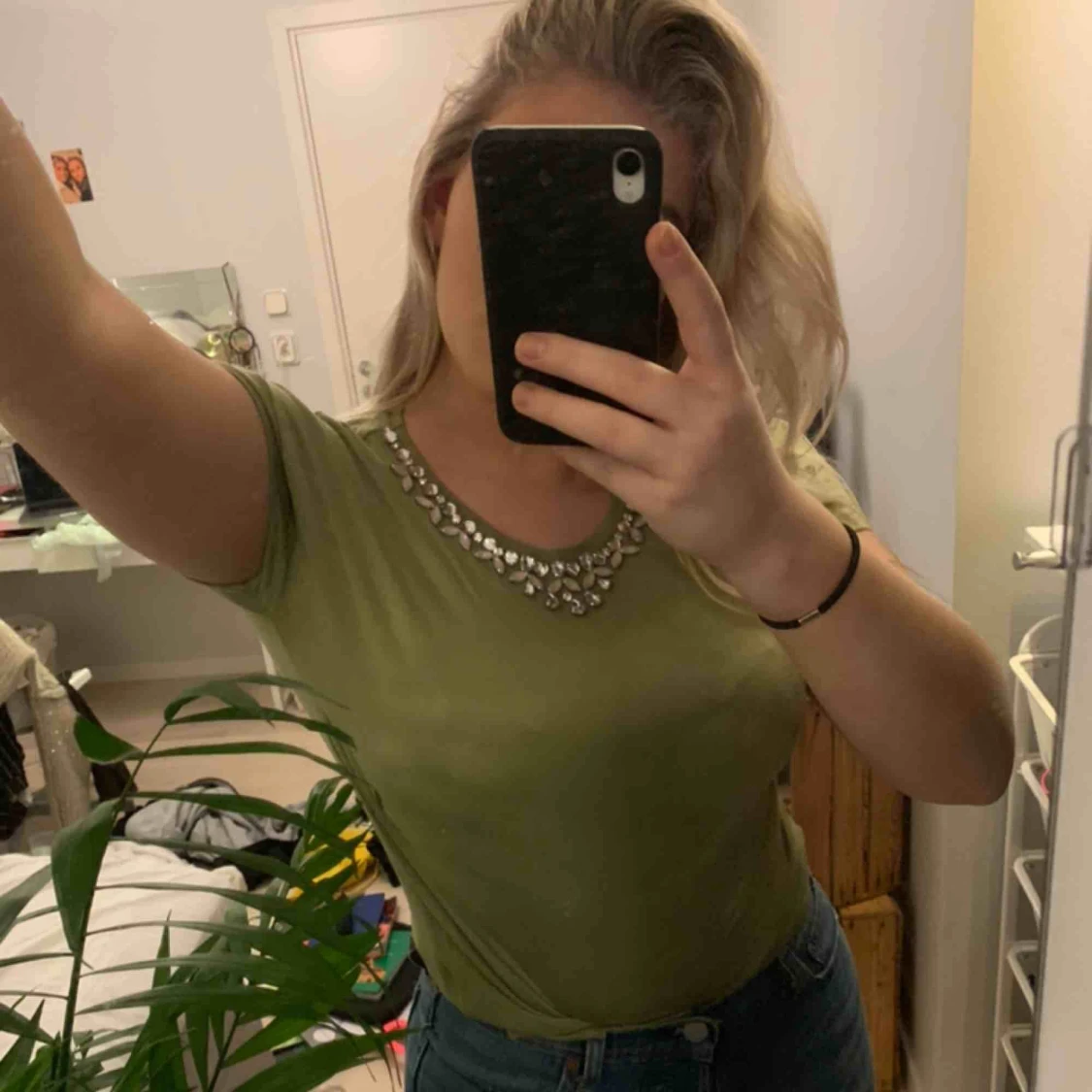 En grön t-shirt akrtig blus med kristallstenar runt halsen som livar upp den. Materialet är super mjukt & extremt stretchigt.
