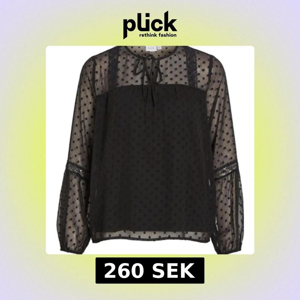 Säljer en svart transparent blus från Vila med prickigt mönster och fina spetsdetaljer på axlar och ärmar. Blusen har knytning vid halsen och långa, luftiga ärmar med resår vid handlederna. Perfekt för dig som gillar en trendig och luftig look. Strl 34 men passar mig mig som xs. Ny pris 349kr
