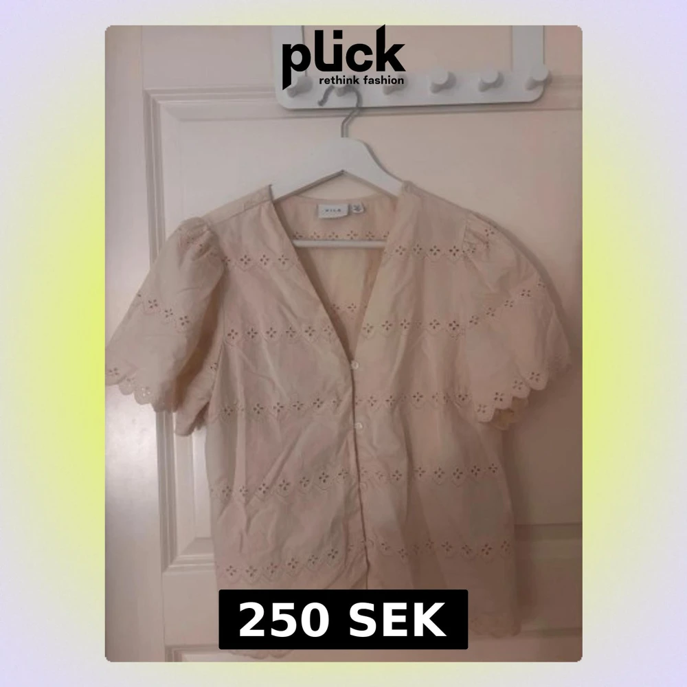 Söt beige blus från Vila med korta puffärmar och v-ringning. Blusen har dekorativa broderade hål och knäppning framtill. Tillverkad i ett lätt bomullstyg med vågig kant vid ärmslut och nederkant. Blusen är använd vi få tal gånger. Pris kan diskuteras