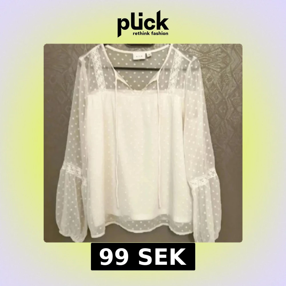 Superfin vit blus från Vila med transparenta, långärmade ärmar i mesh och små prickar. Blusen har spetsdetaljer vid axlar och ärmar, v-ringning med knytband och en luftig, flowy passform. Perfekt till jeans eller kjol för en fräsch look.