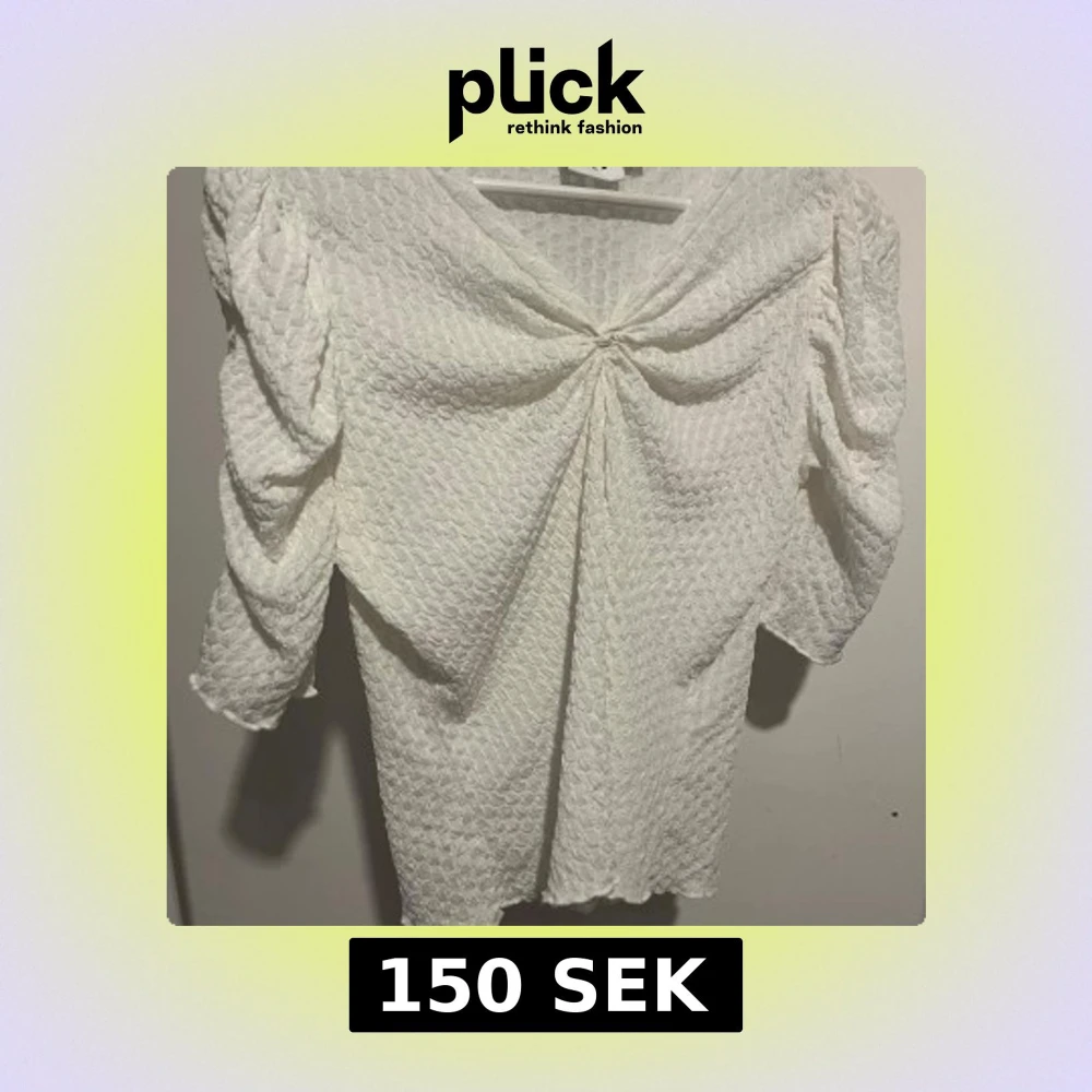 Elegant vit blus med v-ringning och trekvartsärm. Blusen har en unik textur och ett knytliknande detalj framtill som ger en stilfull look. Perfekt för att lyfta vilken outfit som helst.