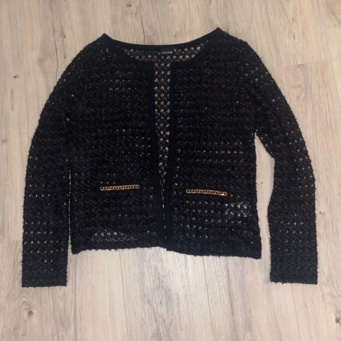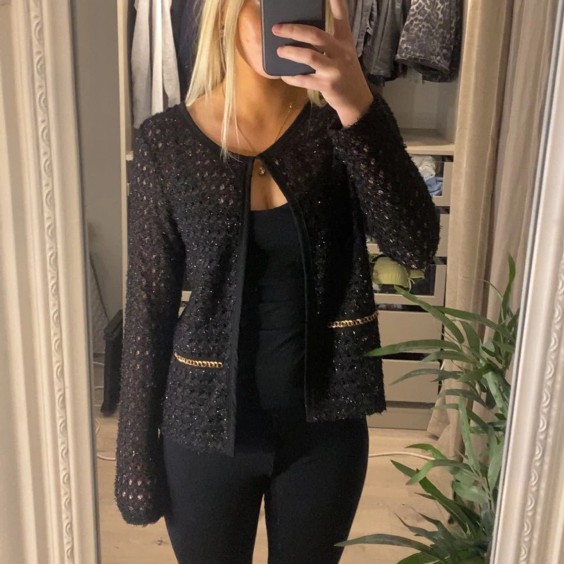 Super söt glittrig kofta. Den är svart glittrig med två guld detaljer på fickorna. Koftan är i strl 40/42 men passar mig som brukar ha s/m🥰