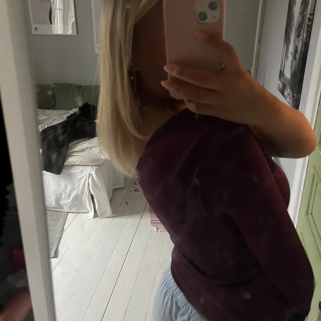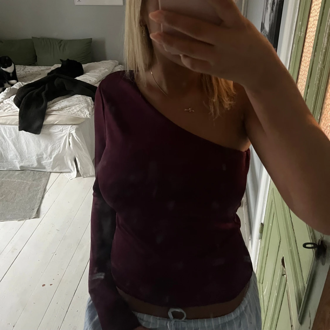 Säljer en snygg vinröd oneshoulder-topp från MQ. Passar till fest och vardags. Aldrig andvänd så är i perfekt skick. Färgen kan missuppfattas lite på dom tre första bilderna men man ser tydligare på sista bilden💝köpt ny runt 500kr