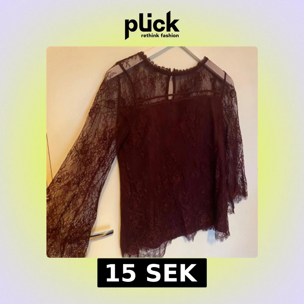 Säljer en elegant vinröd spetsblus med långa ärmar och vackra spetsdetaljer. Blusen har en rund hals och en liten knapp i nacken för stängning. Perfekt för en stilfull look.