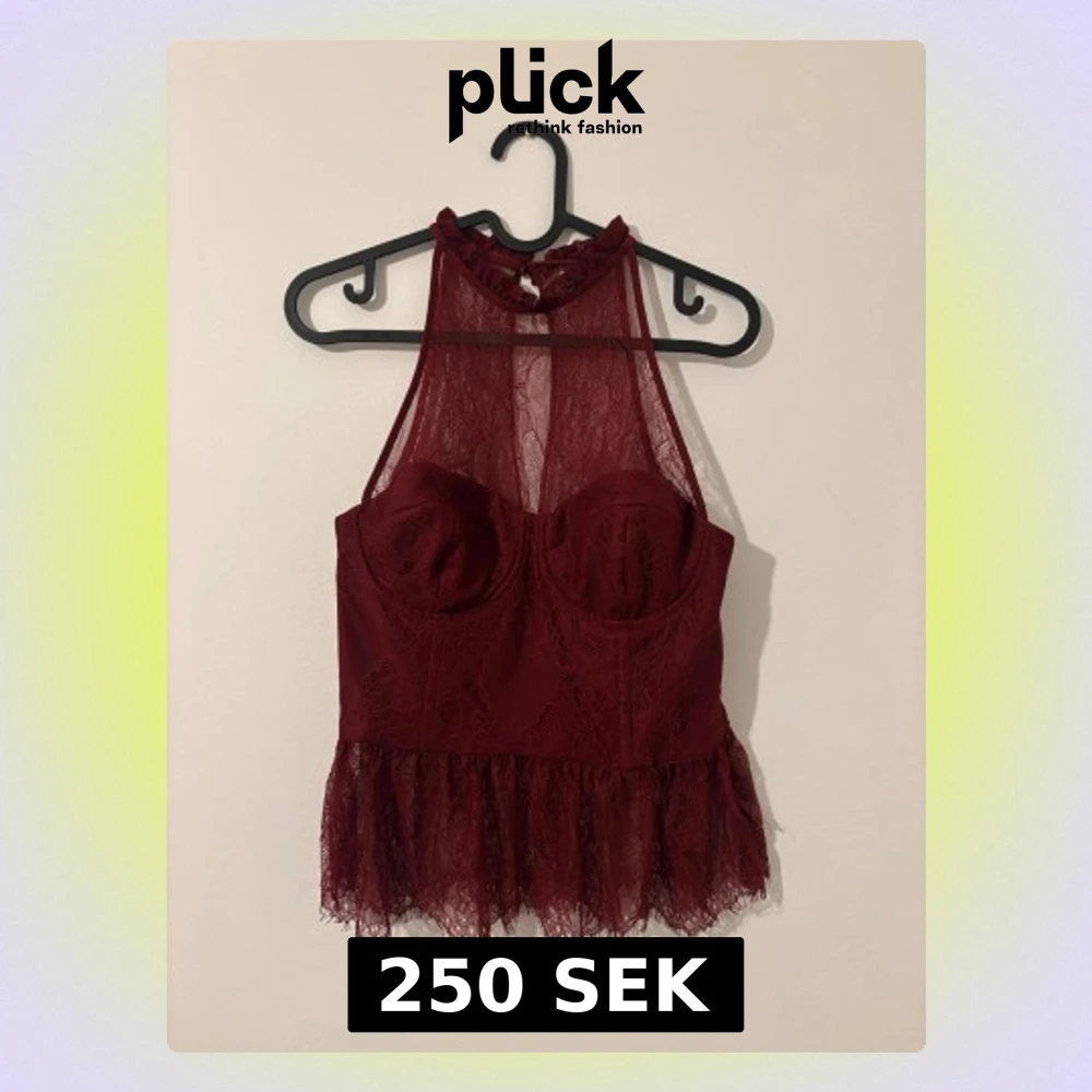 Supersnygg vinröd korsett från zara med blommig spets, hög hals och volangkant nedtill. Toppen har formade kupor, transparent mesh upptill och dragkedja i sidan. Perfekt för dig som vill sticka ut med en chic och edgy look.