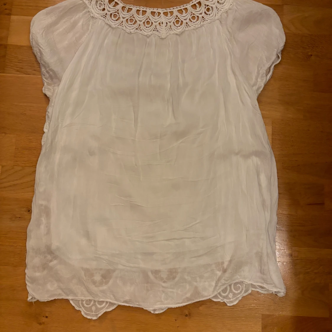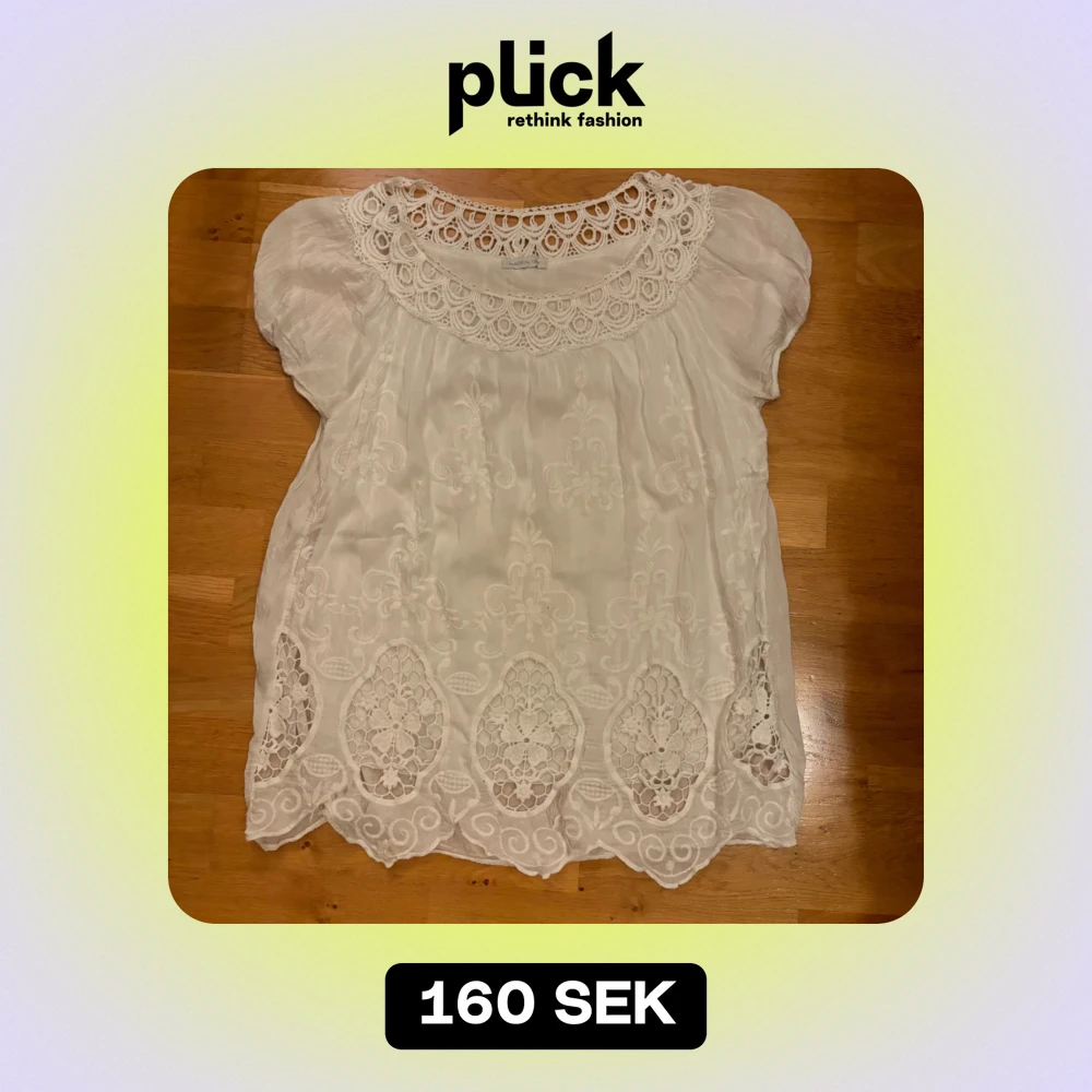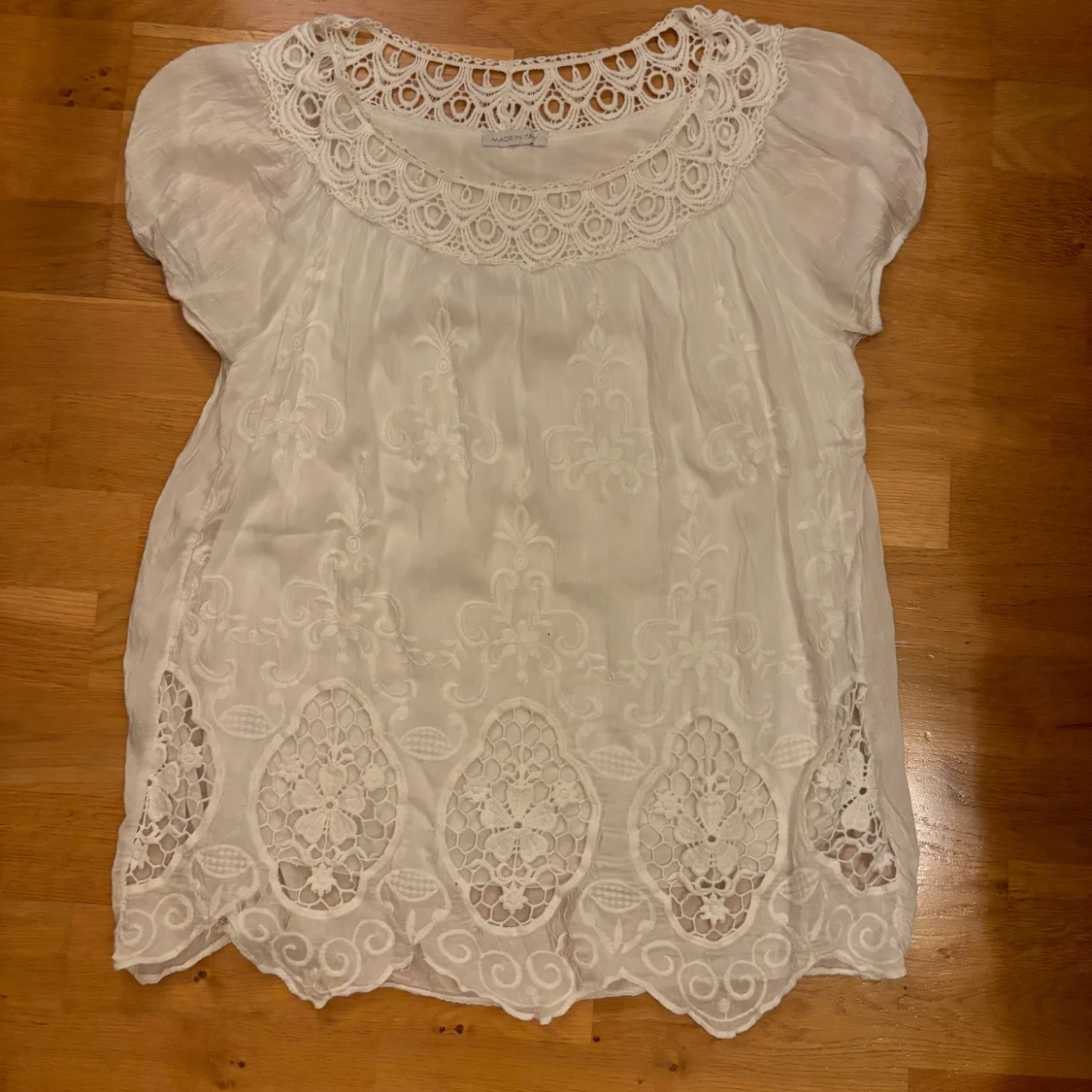 Jättefin, vit, vintage topp med broderier. Perfekt att ha antingen till vardagen eller på en tillställning! Vid fråga kan jag skicka en närmare bild på broderiet. Toppen har några lösa trådar här och där så priset går att diskutera!