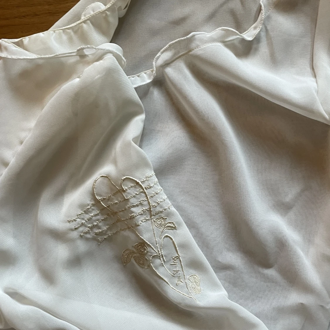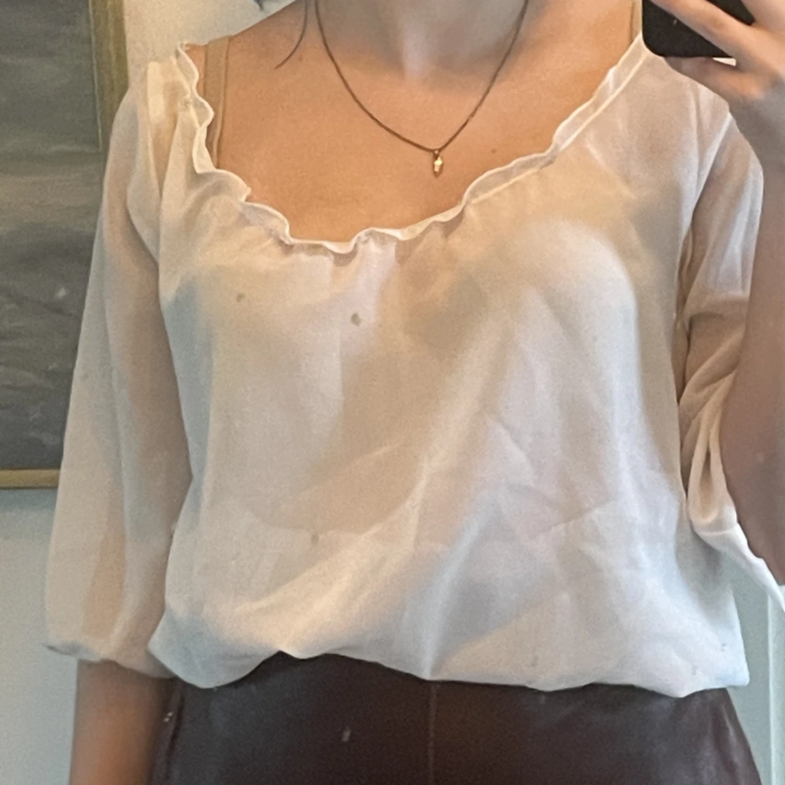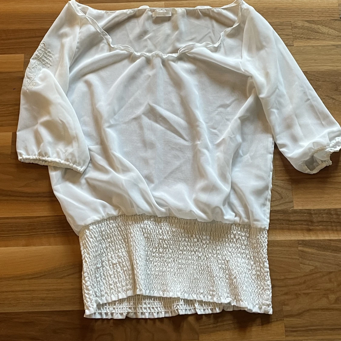 Vit blus med ihopdragning längst kanten. Sitter väldigt löst på mig (169-M-75c) men är jättefin ändå. Kontakta för fler bilder eller frågor!