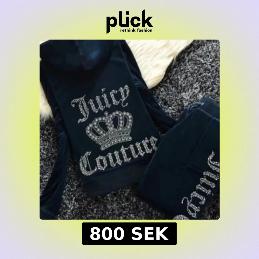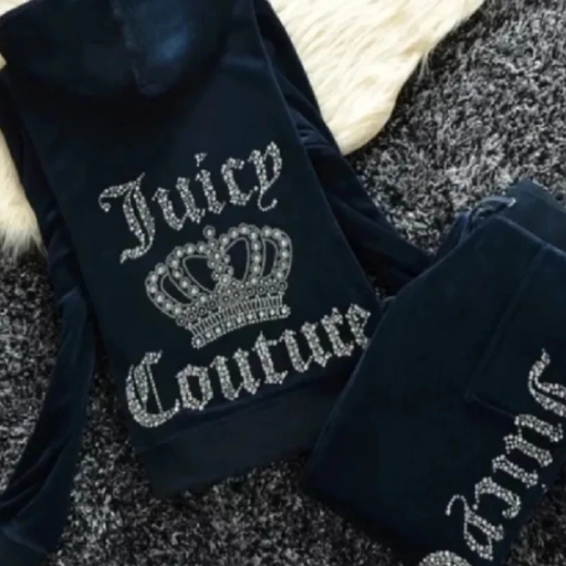 Svart velourbyxor och kofta från Juicy Couture med glittrig logga längs benet och diamanter på ryggen. Byxorna har normal passform och resår i midjan. Perfekta för en avslappnad och trendig look. Y2K några diamanter vid byxorna har lossnat men koftan är i bra skick! Jätte fin för vintage look!
