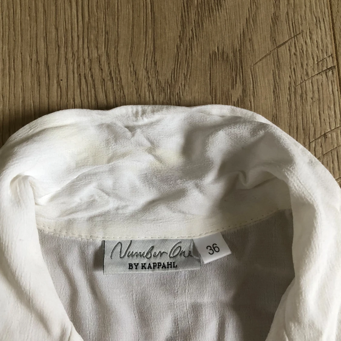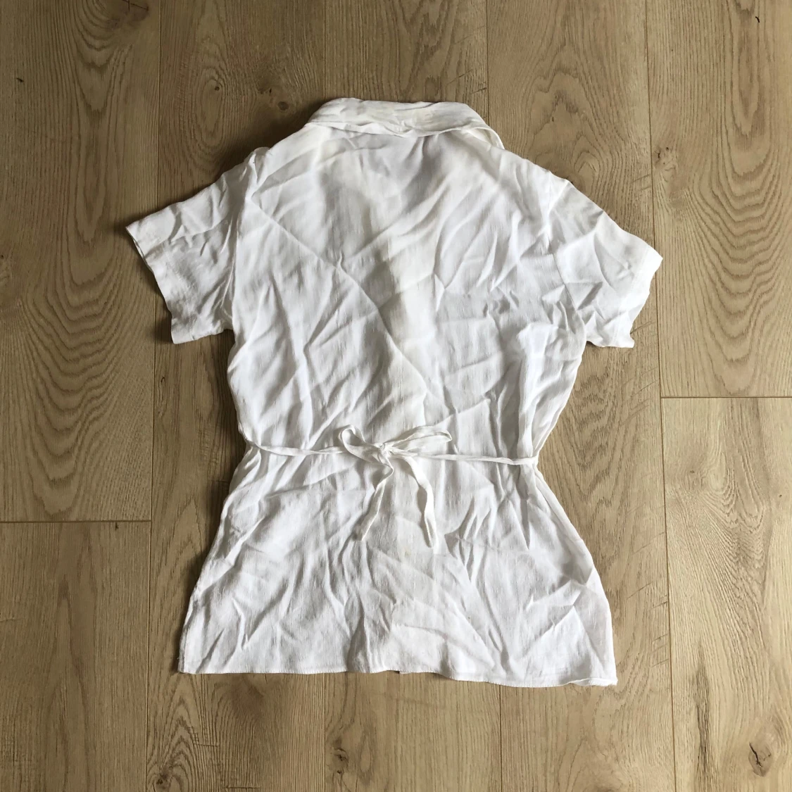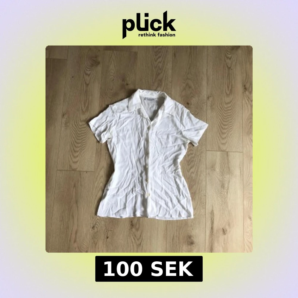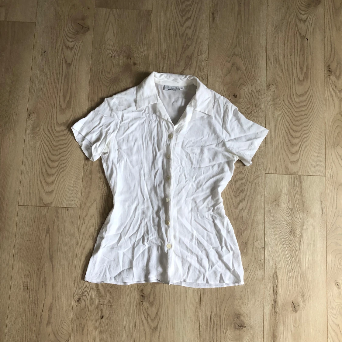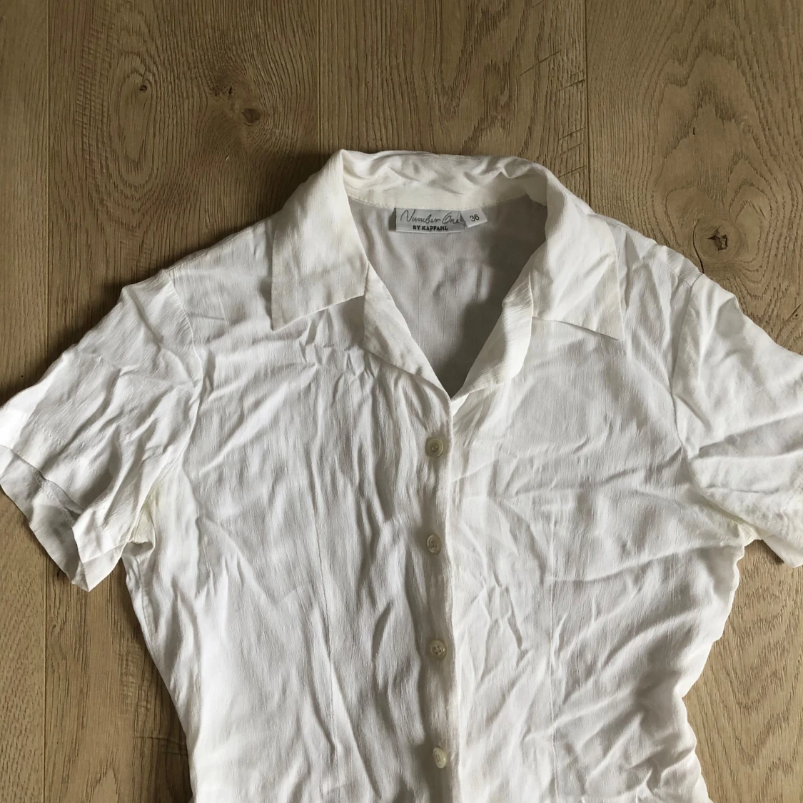 Vit söt blus från KappAhl Number One i storlek 36, kortärmad med klassisk krage och knappar framtill. Skjortan har en feminin passform och ett knytband i midjan för extra stil. Gjord i viscose, vilket ger en lätt och luftig känsla. Passar snyggt till mörkblå jeans eller kjol för en clean look.