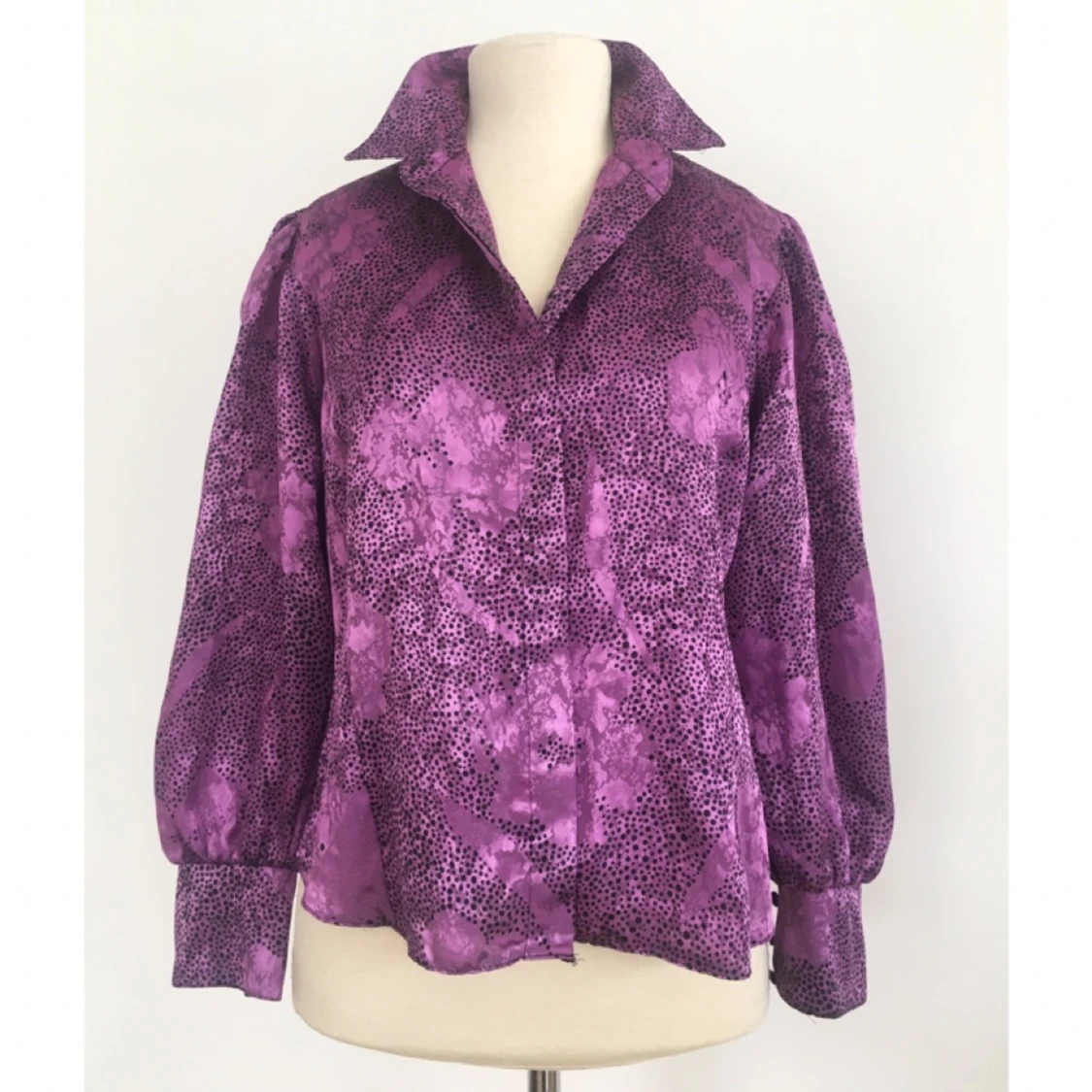 Mönstrad vintage-blus i läcker lila nyans. Märke: Saknas (Vintage). Storlek: 36/38 Skick: Mycket gott. Använd endast en gång. Pris: 200 kronor Frakt: Betalas av köparen.