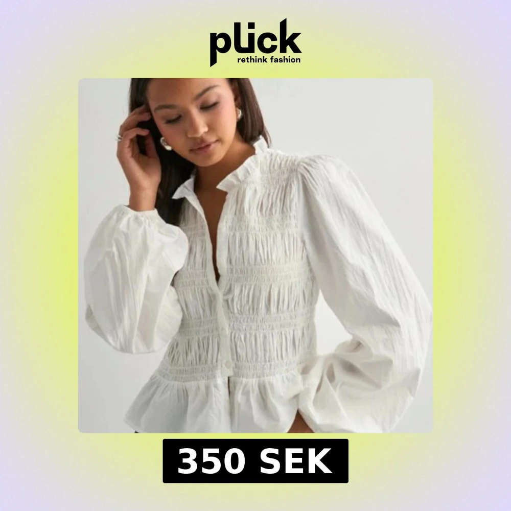 Superfin vit blus med smockad överdel, volangkant nertill och stora puffärmar. Skjortan har knappar framtill och en liten ståkrage som ger en romantisk vibe. Perfekt att styla med jeans eller kjol för en trendig look.