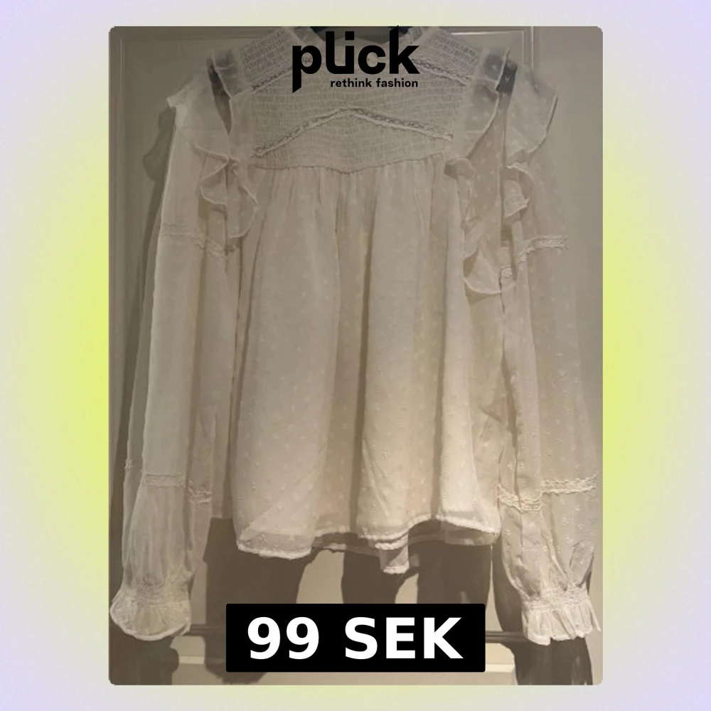Vit blus med volang från Zara XS - Supersöt vit blus från Zara i storlek XS med v-ringning, volangdetaljer och spets längs bröstet. Inga fläckar eller hål ❤️men lite krymt i tvätten så den är mindre i storlek