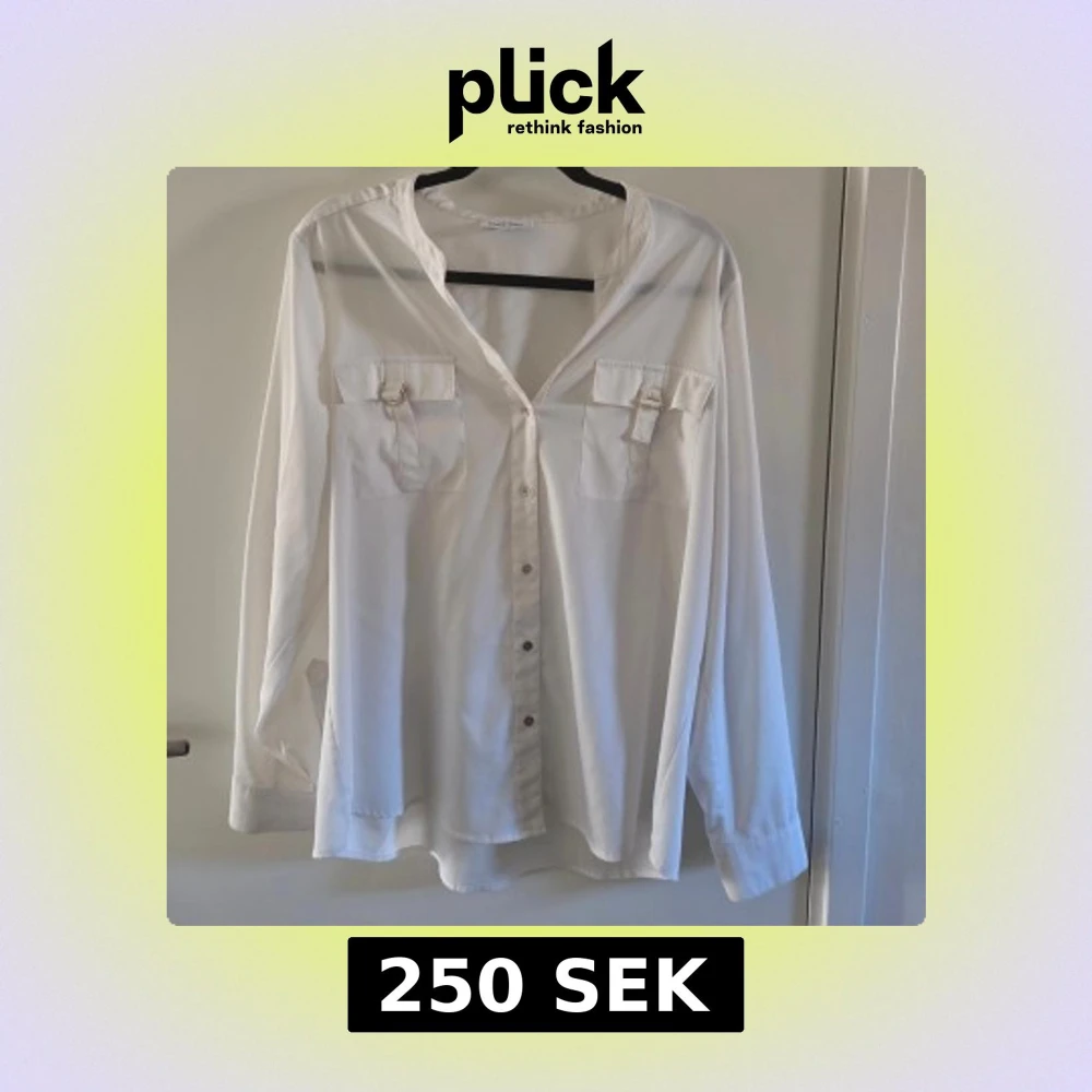 Snygg vit blus från Calvin Klein i satinliknande material. Skjortan har v-ringning, knappar framtill och två bröstfickor med guldfärgade ringdetaljer. Långärmad modell med möjlighet att vika upp ärmarna. Perfekt för en clean och stilren look. Köpt i USA.