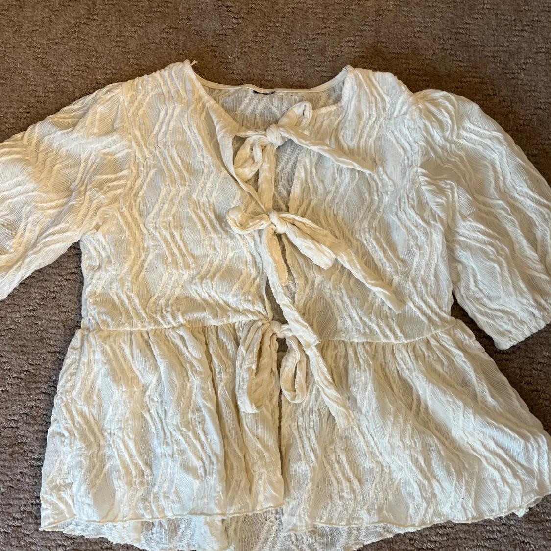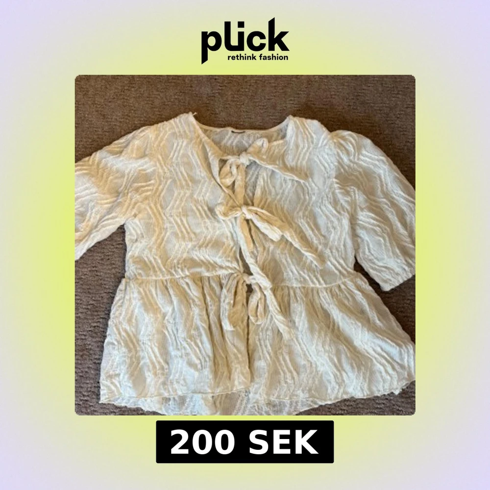 Supersöt vit blus från Gina Tricot med vågig struktur och tre knyt framtill. Tunt och luftigt tyg. Aldrig använd, vill blir av med den så övriga prisförslag tas gärna emot🤍