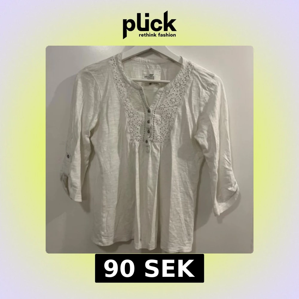 Säljer en söt vit blus från H&M med vackra spetsdetaljer och knappar framtill. Blusen har trekvartsärmar och en avslappnad/ tight passform