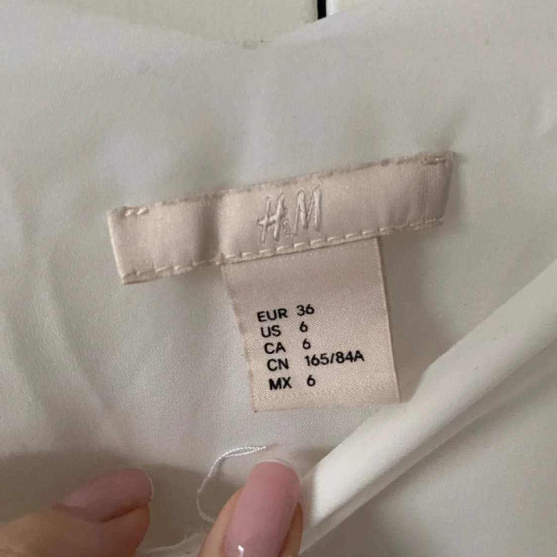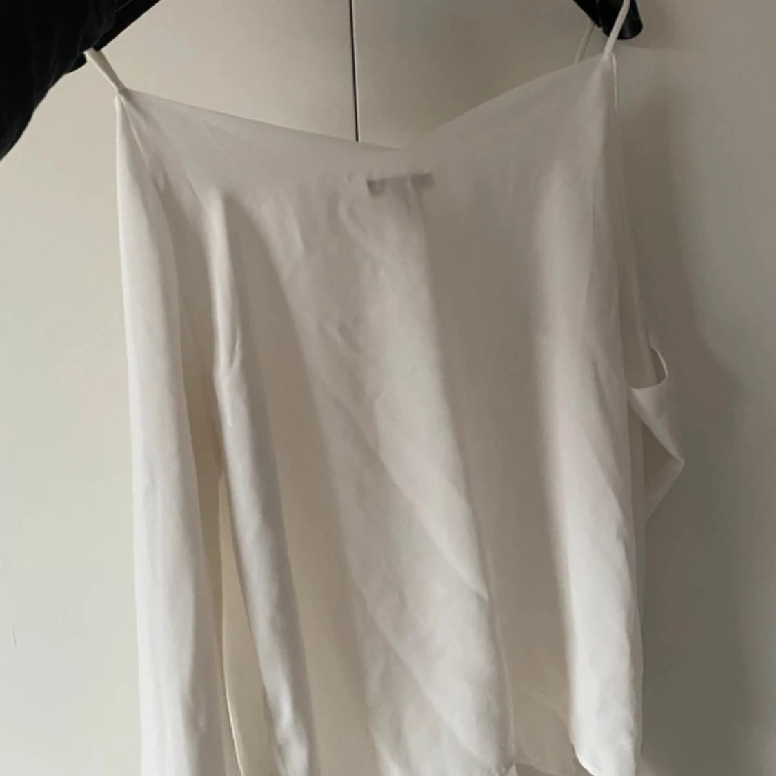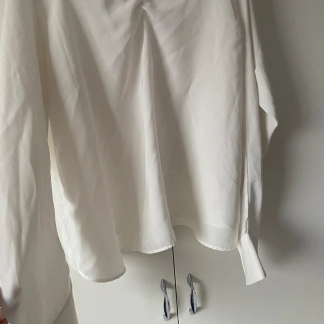 Säljer en stilren vit blus från H&M i storlek 36. Blusen har långärmade ärmar och är gjord i ett tunt, flowy material som känns lätt och luftigt. Perfekt att styla med jeans eller kjol för en clean look.