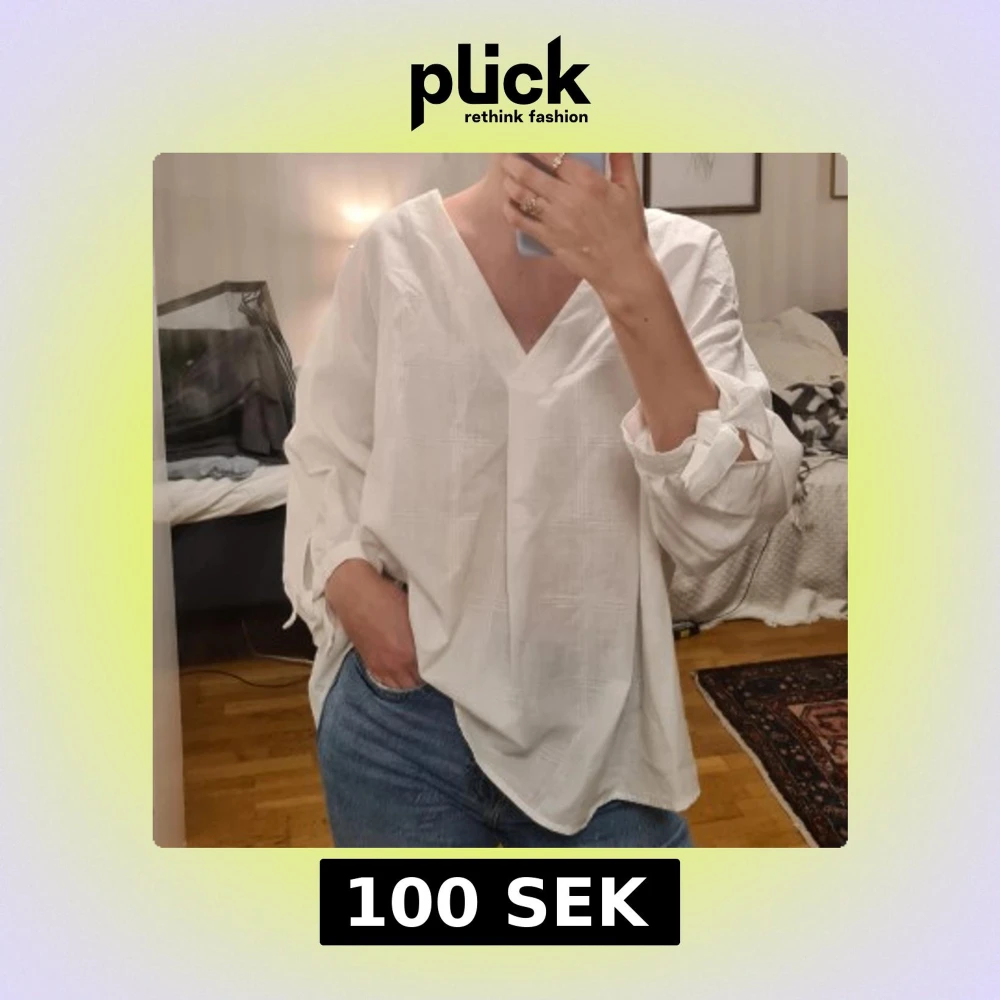 Säljer en stilren vit blus från H&M med v-ringning och långa ärmar. Blusen är ffa av bommull men även linne.