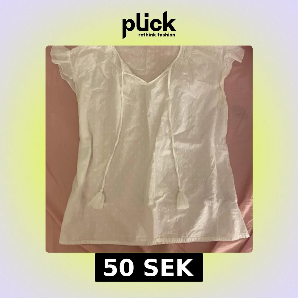 Säljer en söt vit blus från Indiska med korta ärmar och knytband framtill. Blusen har ett diskret prickigt mönster. Den har ett lätt och luftigt material.