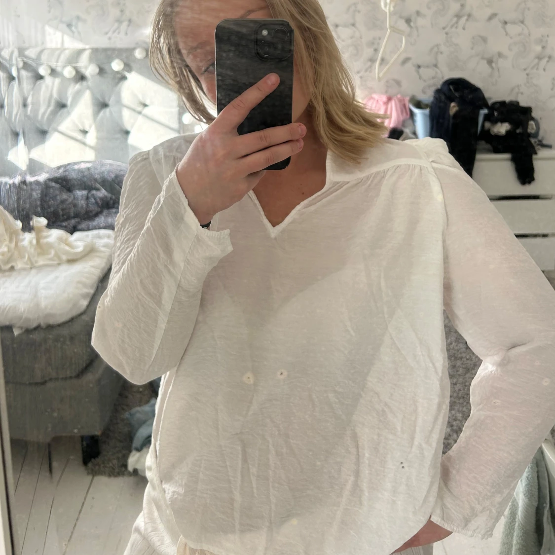 Säljer en luftig och stilren vit blus från Kappahl med v-ringning och långa ärmar. Perfekt till både jeans och kjol. Blusen har en avslappnad passform och är gjord i ett tunt, skönt material.