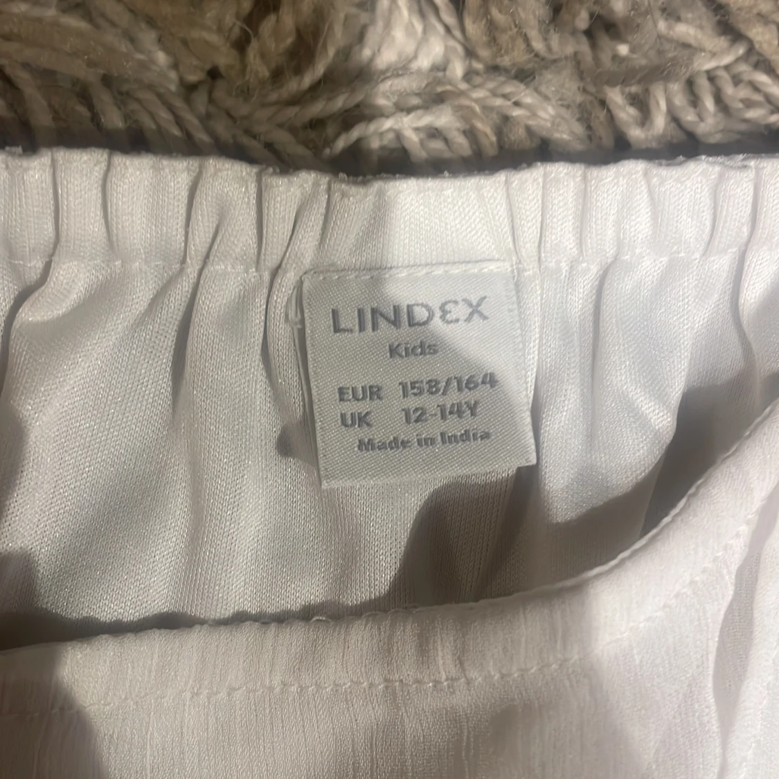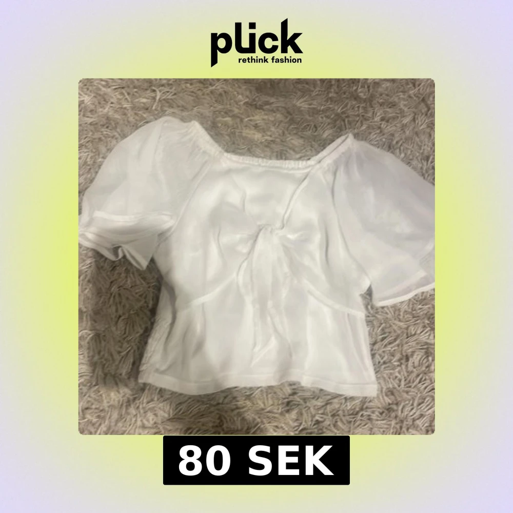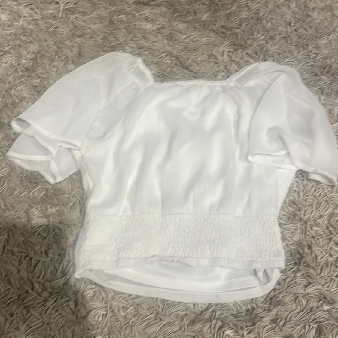 Säljer en söt vit blus från Lindex med puffiga korta ärmar och en knytning framtill. Blusen har en elastisk detalj vid midjan för en bekväm