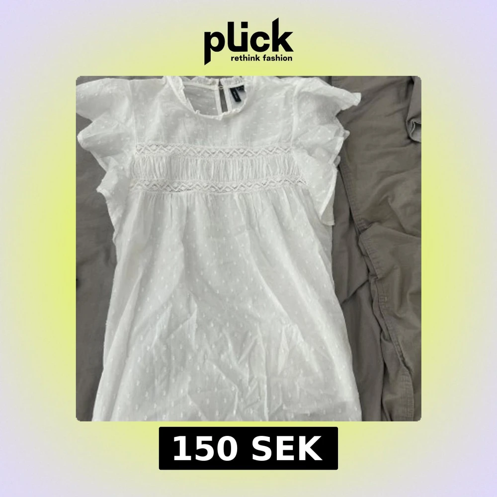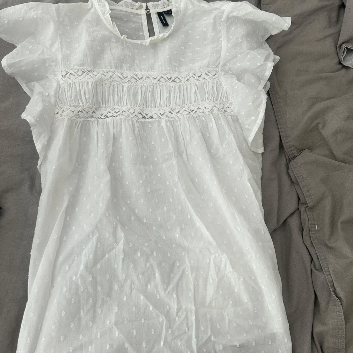 Supersöt vit blus från Vero Moda i tunn bomull med diskret prickigt mönster, volangärmar och spetsdetaljer över bröstet.
