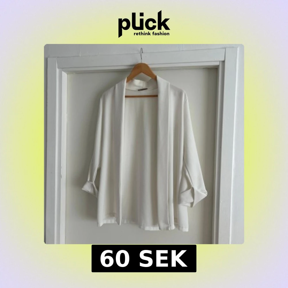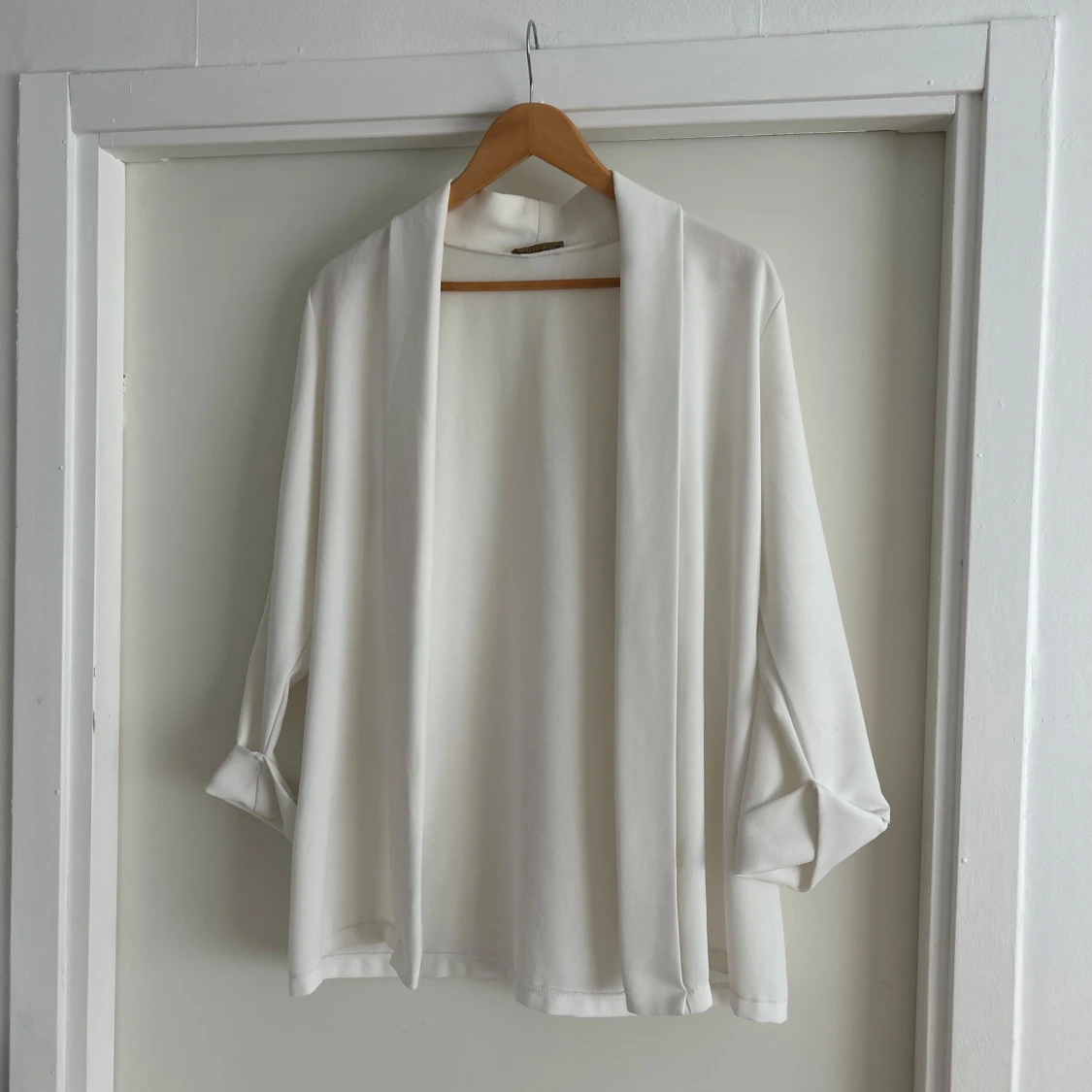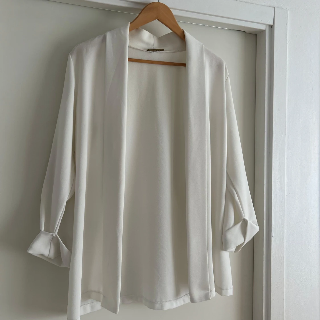 Stilren vit blus kofta med omlottkänsla och lös passform. Jackan har långa ärmar och ett mjukt, lätt tyg som faller snyggt. Perfekt för lager-på-lager och enkel att matcha med olika outfits.