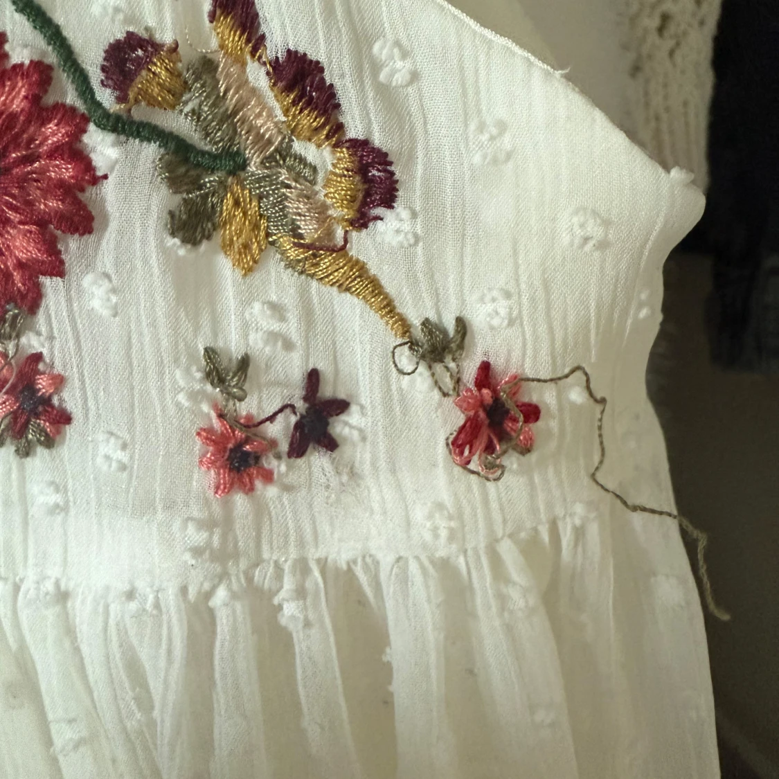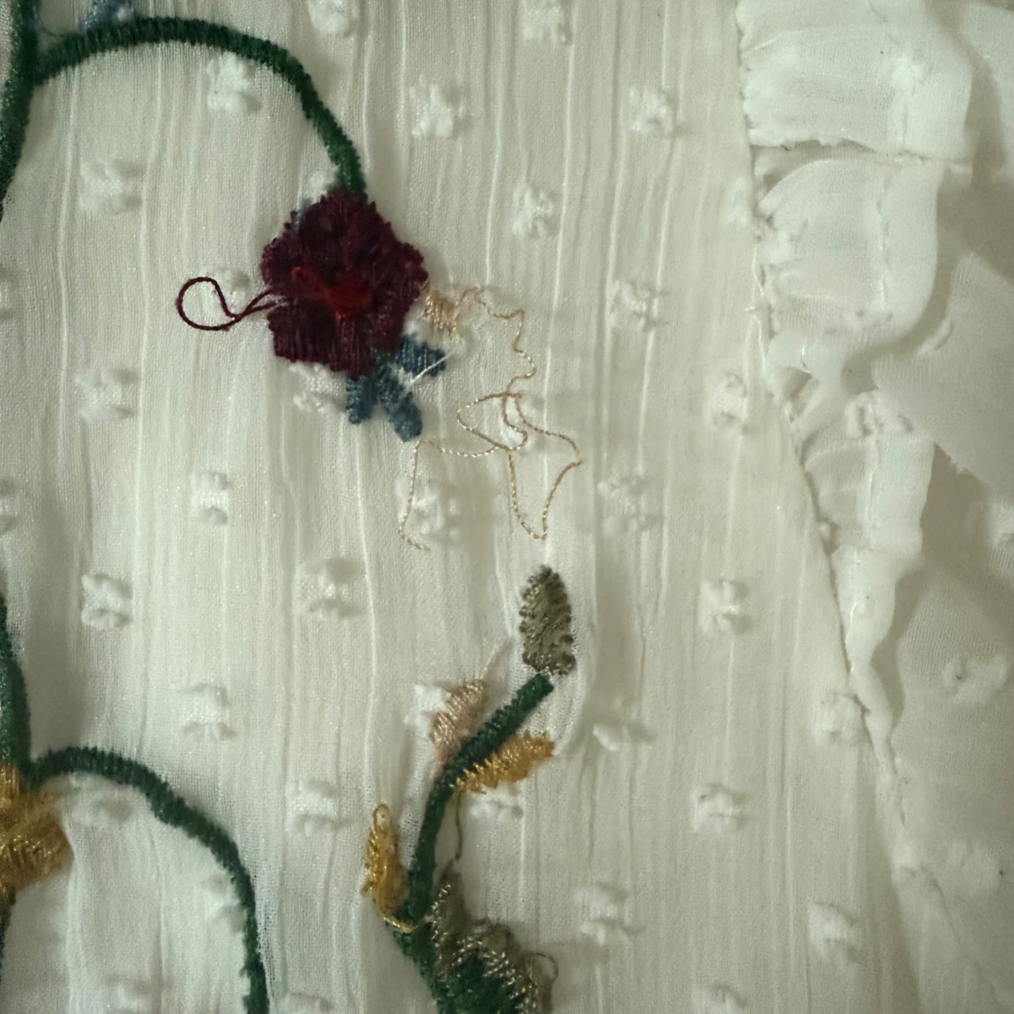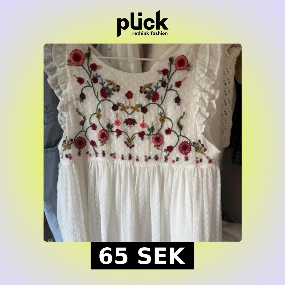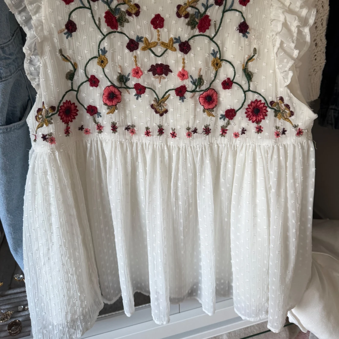 Superfin vit blus med broderade blommor i rött, rosa och gult. Blusen har volangdetaljer vid axlarna och är ärmlös. Tunt, lätt tyg med diskret struktur och romantisk känsla. Perfekt för sommarens alla tillfällen! Lite lösa trådar men det går säkert att fixa, där av lågt pris. Skriv för fler bilder eller frågor!