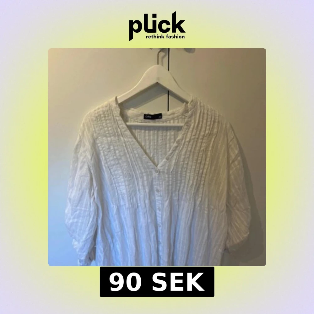 Säljer en luftig vit blus från Cubus i storlek 42. Blusen har v-ringning, knappar framtill och ett diskret randigt mönster i tyget. Perfekt för en avslappnad och stilren look. Den sitter som en M/L