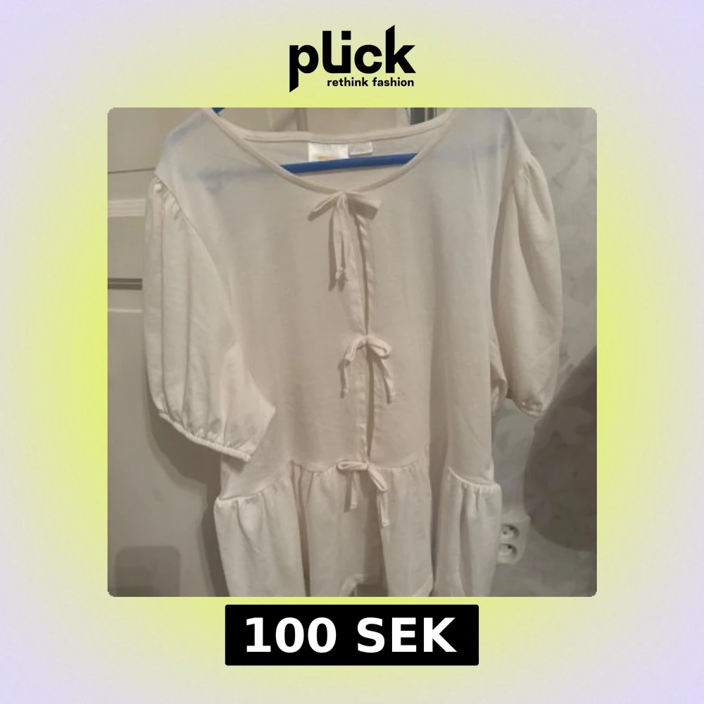 Söt vit blus med tre knytband framtill och puffiga korta ärmar. Klänningen har en avslappnad passform och volang nedtill, perfekt för varma dagar.