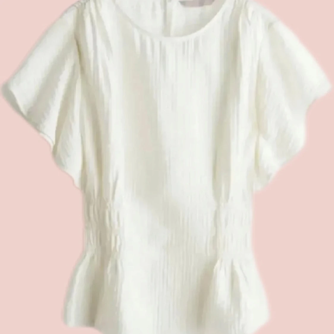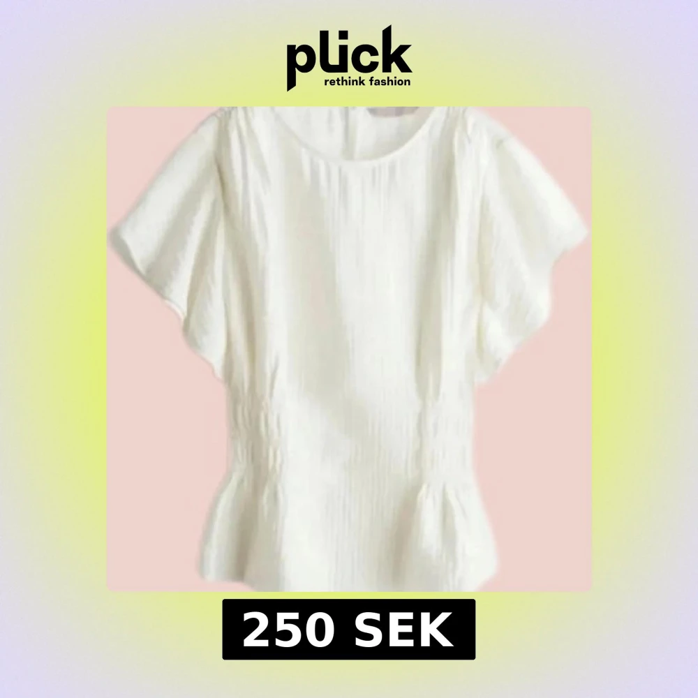 Säljer en stilren vit blus med korta, vida ärmar och en smickrande passform. Blusen har en lätt textur och en elastisk midja som ger en fin siluett. Perfekt för både vardag och speciella tillfällen.