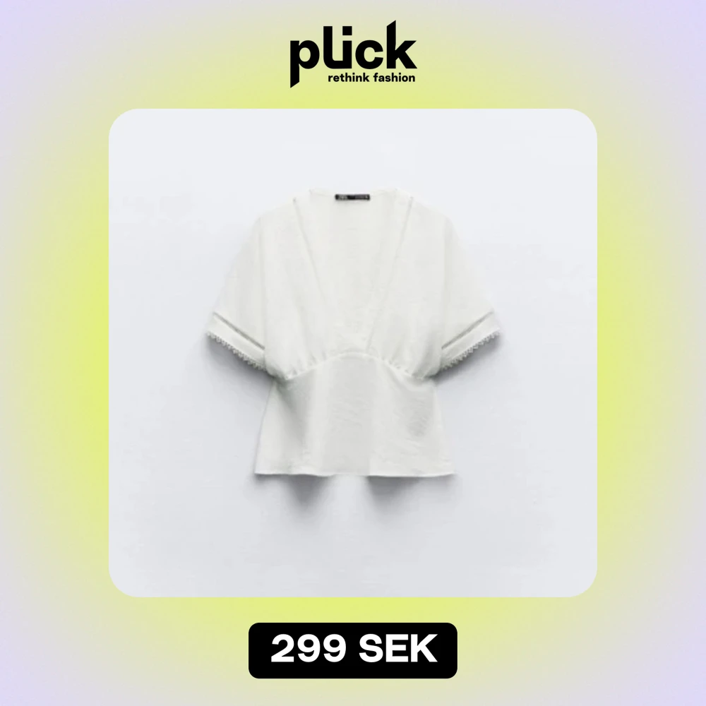 Säljer en superfin vit blus med v-ringning och spetsdetaljer vid ärmslut och hals. Den har korta ärmar och en lös passform som gör den perfekt för sommardagar. Blusen är gjord i ett lätt och luftigt material, vilket gör den bekväm att bära hela dagen. Den är slutsåld på Zara. Nypris 379.