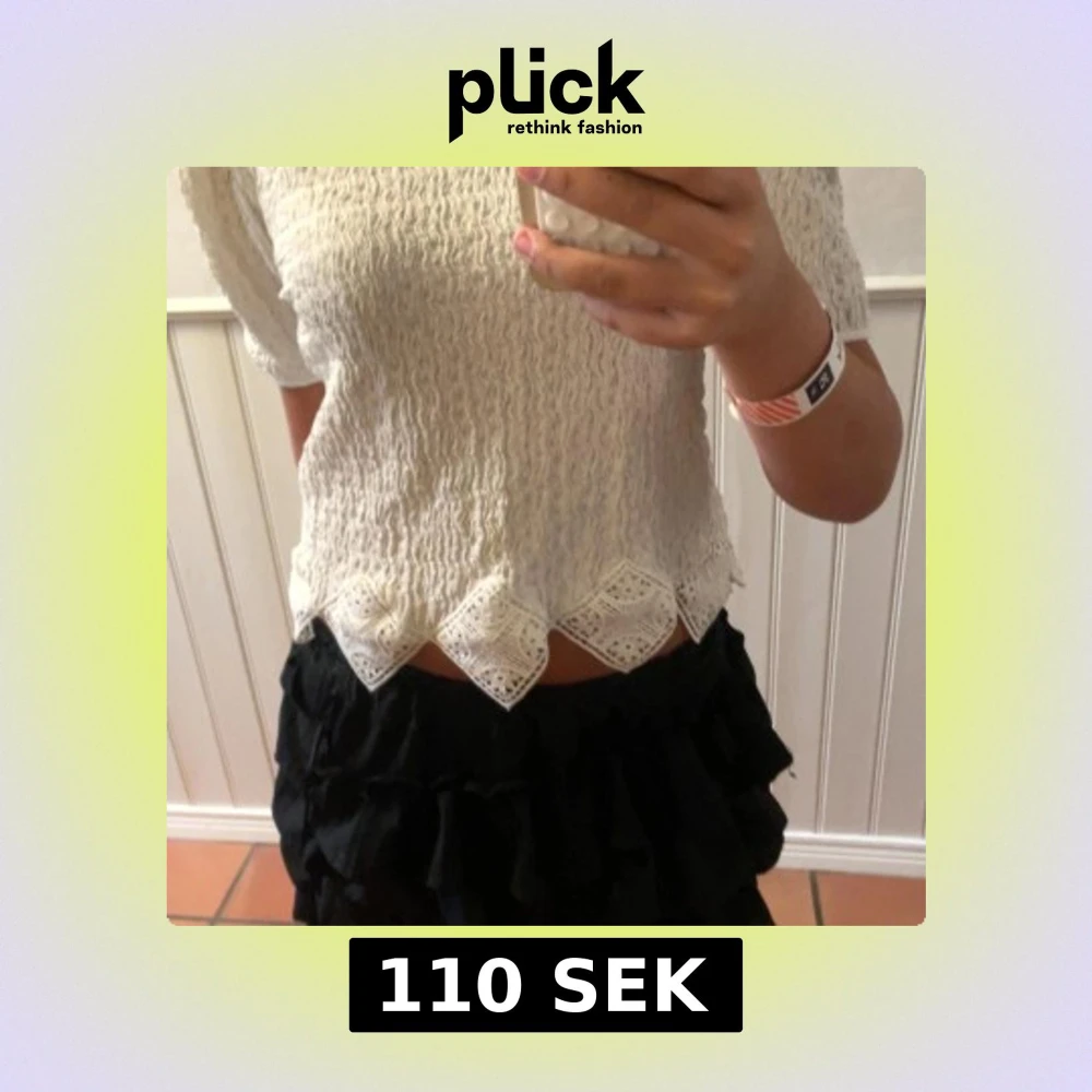 Supersöt vit blus från Zara med kort puffärm och unik spetskant nertill i geometriskt mönster. Tyget är lätt strukturerat och blusen har en lite croppad passform. Perfekt för dig som gillar romantiska detaljer och vill sticka ut lite extra. Använd ca 2-3 gånger men kommer som ny