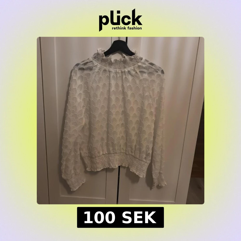 Säljer en vit blus från ONLY med transparent tyg och strukturmönster. Blusen har långärmade ärmar, smock vid hals och nederkant samt volangdetaljer. Materialet är lätt och luftigt, perfekt för dig som gillar romantisk stil.