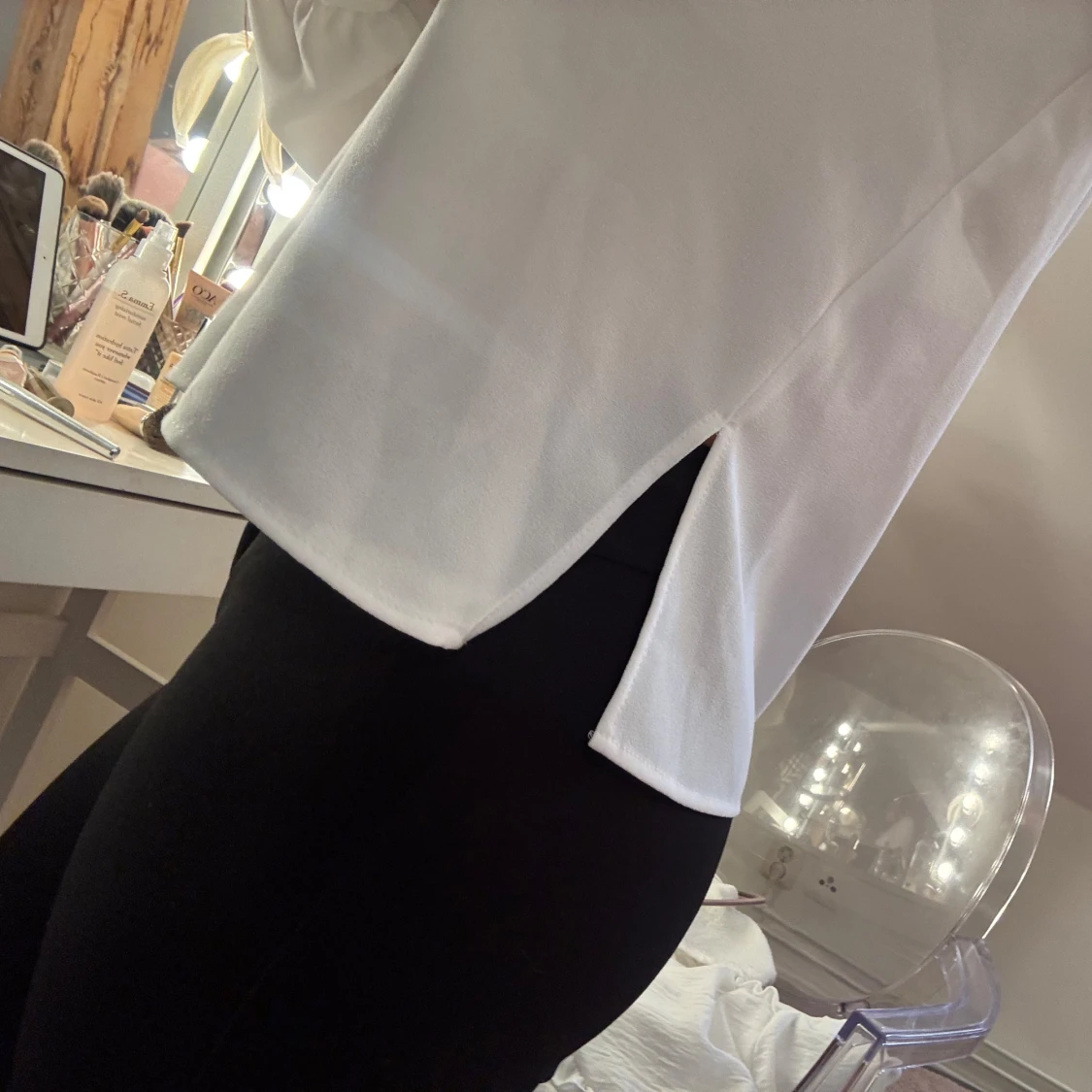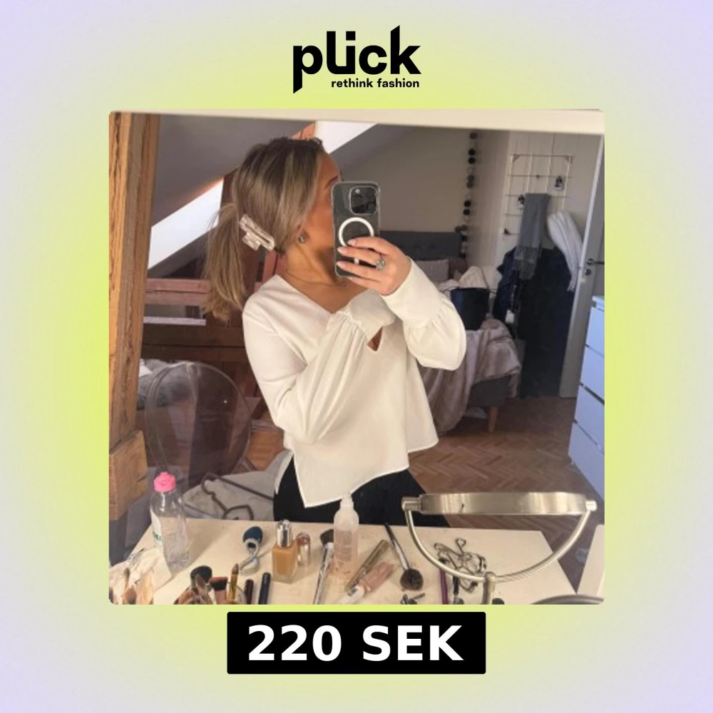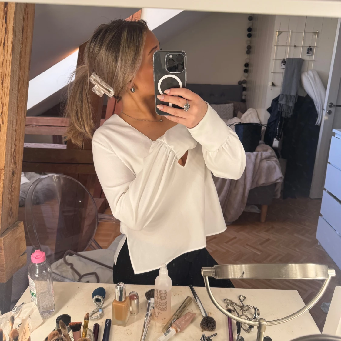 Säljer en stilren vit blus med v-ringning och långa ärmar. Blusen har en lös passform och små slitsar på sidorna som ger en fin detalj. Perfekt för både vardag och festliga tillfällen. Storlek M men passar mig som brukar bära Xs/S.