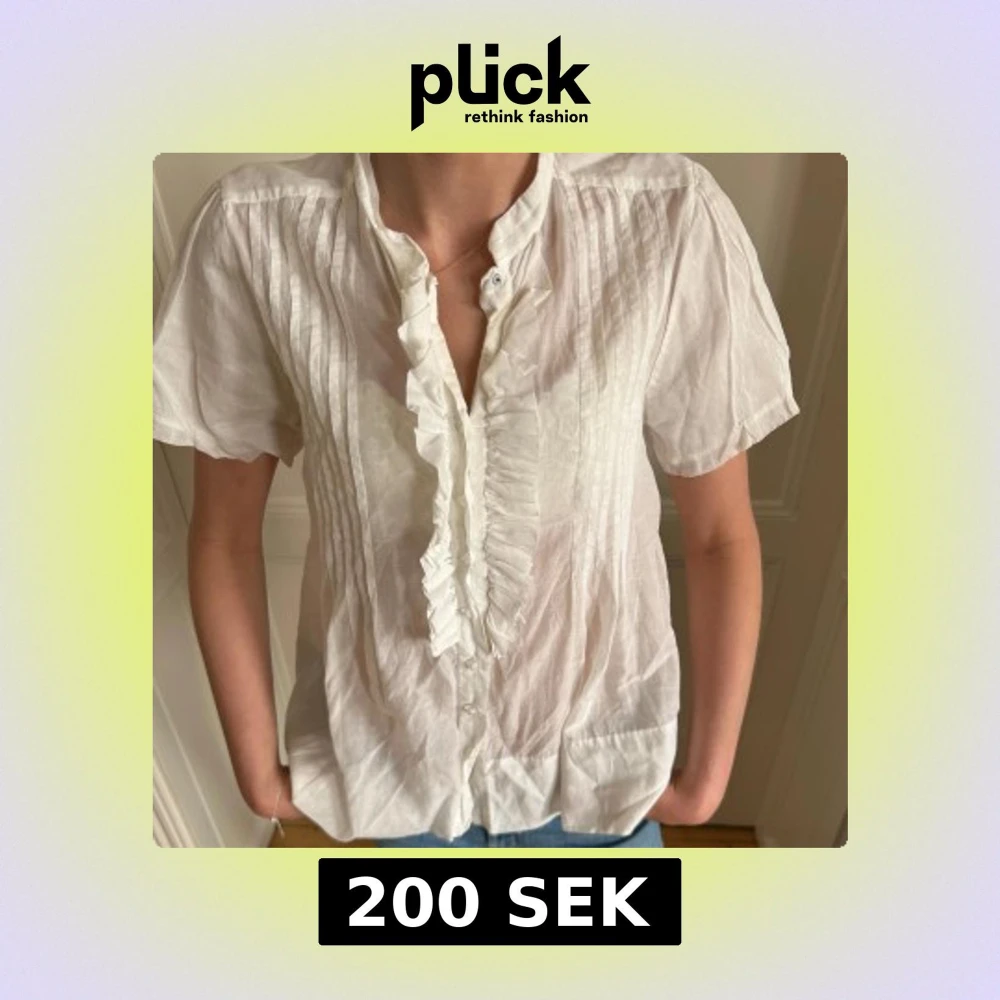 Supersöt vit blus med korta ärmar och volang längs knäppningen från By Malene Birger. Blusen har knappar framtill och fina veckade detaljer. Storlek 36!
