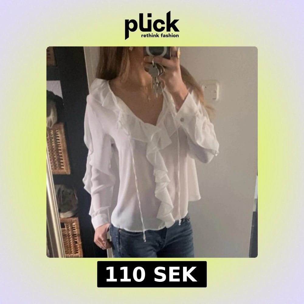 Säljer en vit blus med v-ringning, volangdetaljer längs halsringningen och knytband framtill från Zara. Långärmad modell i ett lätt och luftigt material, perfekt för en chic och feminin look. Säljer då den inte kommer till användning endast använd fåtal gånger. Skriv för fler bilder eller frågor!