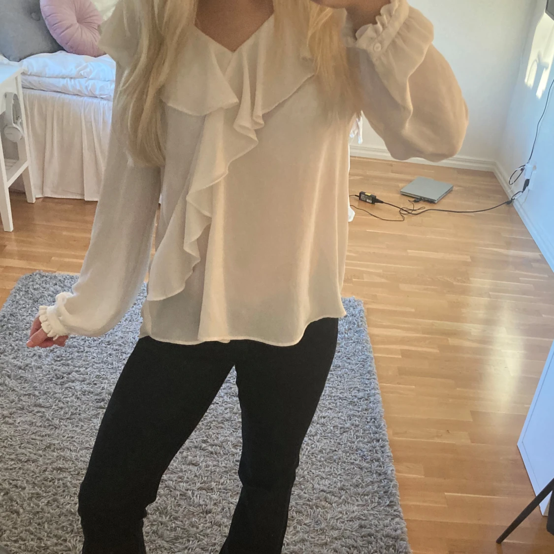 Säljer en elegant vit blus med v-ringning och volangdetaljer framtill. Perfekt för både vardag och speciella tillfällen. Har aldrig använt den så den är som ny