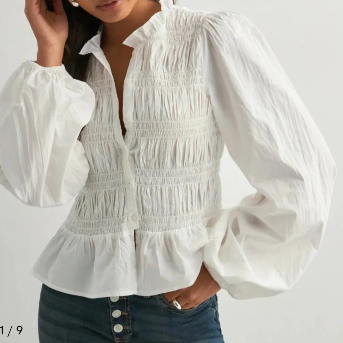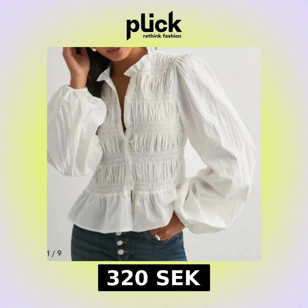 Supersöt vit blus med volangkant nertill och puffiga långärmar. Knabbast andvänd därav säljer nu vidare. 🩷🩷