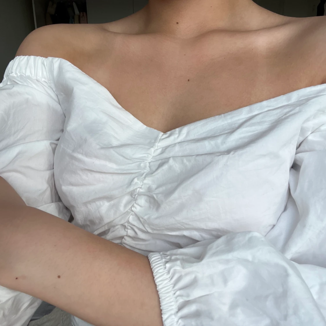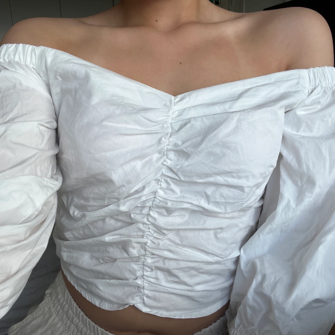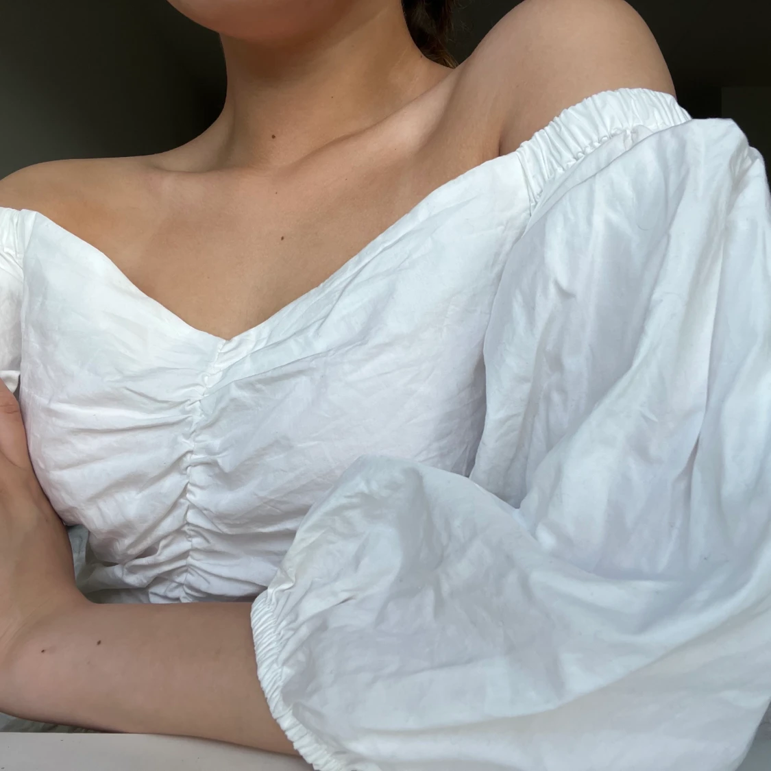 En jättefin vit topp/blus. Har puffärmar och tajt i överkroppen, off shoulder model. Jättefin till fest och till andra festliga tillfällen. Priset kan diskuteras