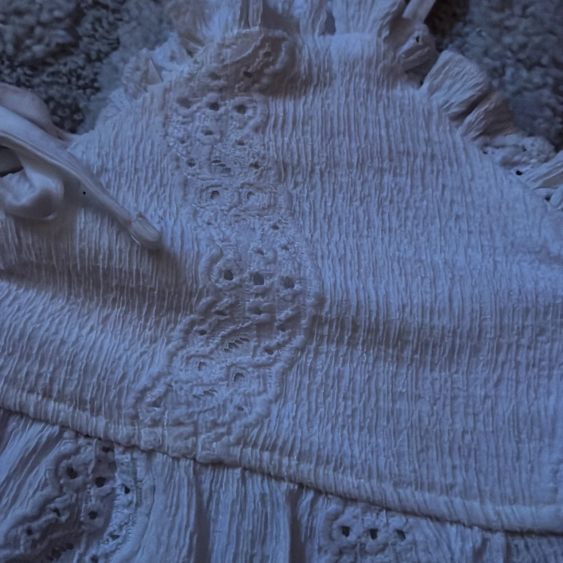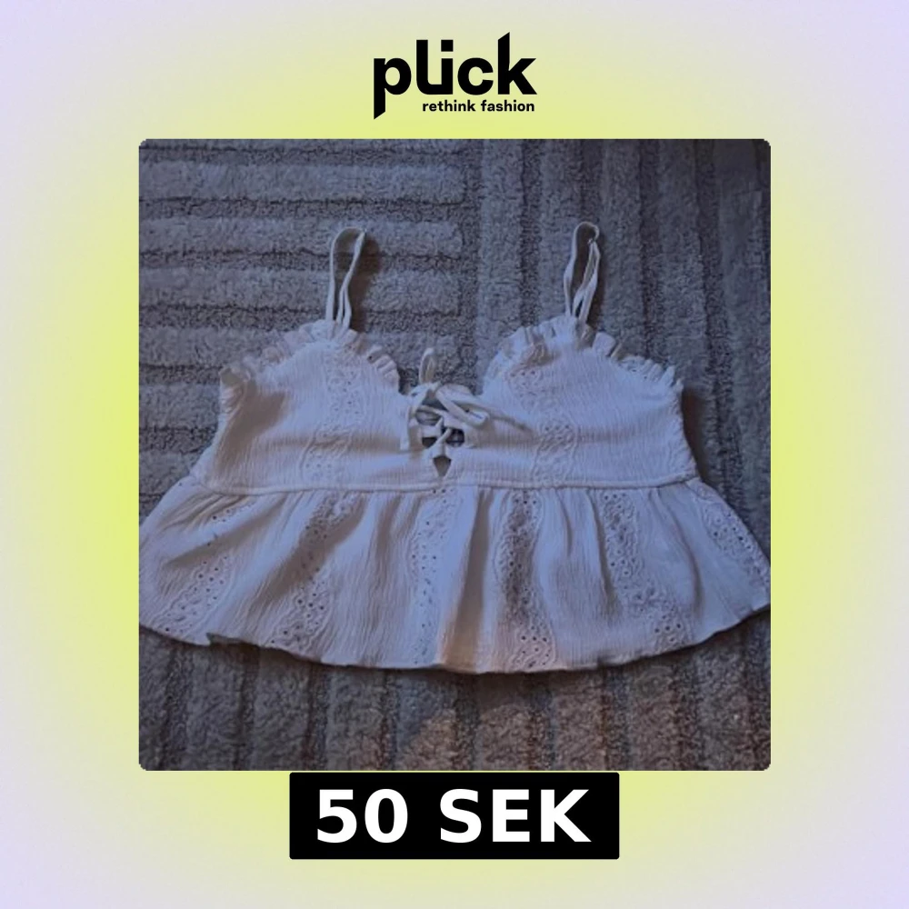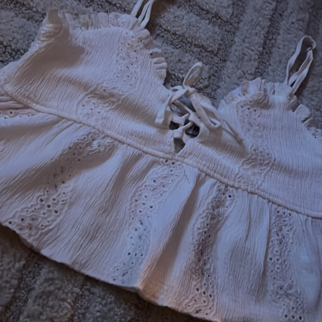Söt vit linnetopp med broderade detaljer och volangkant. Toppen har smala axelband och knytning framtill. Perfekt för varma dagar och ger en romantisk känsla till outfiten.