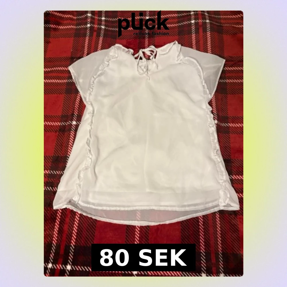 Söt vit blus i transparent material med volangdetaljer längs sidorna och knytning i halsen. Blusen har korta ärmar och v-ringad hals..
