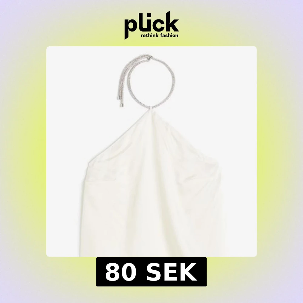 Säljer en elegant vit halterneckblus med ett glittrigt, silverfärgat band som knyts runt halsen. Blusen har en slät och mjuk yta, perfekt för dig som vill sticka ut med stilrena detaljer.